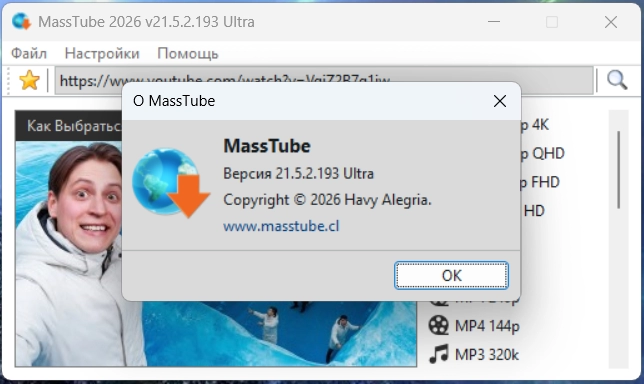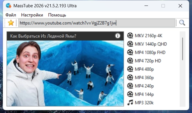 MassTube Ultra — очень простая в использовании программа для скачивания видео с YouTube (и не только) с помощью одного клика. Достаточно в строку поиска вставить адрес понравившегося ролика и нажать поиск, после чего программа предоставит список форматов и разрешений, в которых можно быстро скачать данный клип.