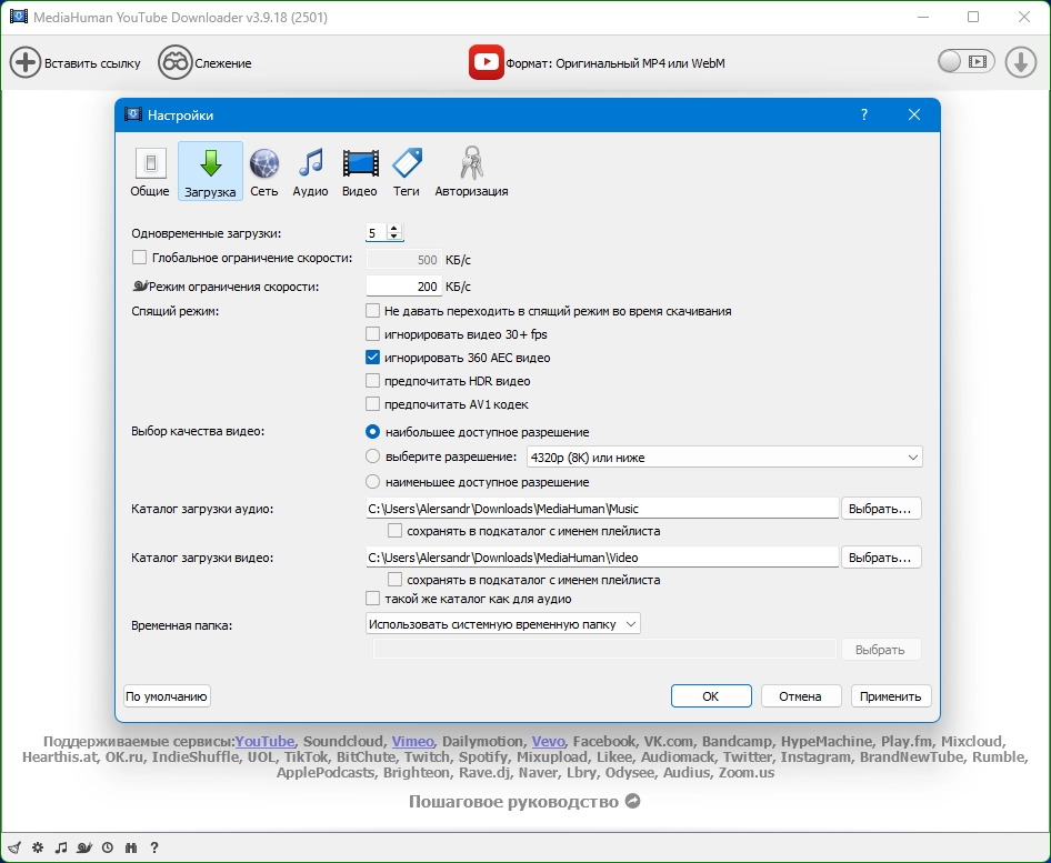Программа поддерживает загрузку всех доступных разрешений, но выбор остается за вами, будет это 720p, 1080p, 4K или 8K, 60 fps или 30.