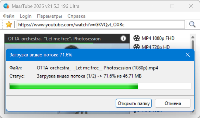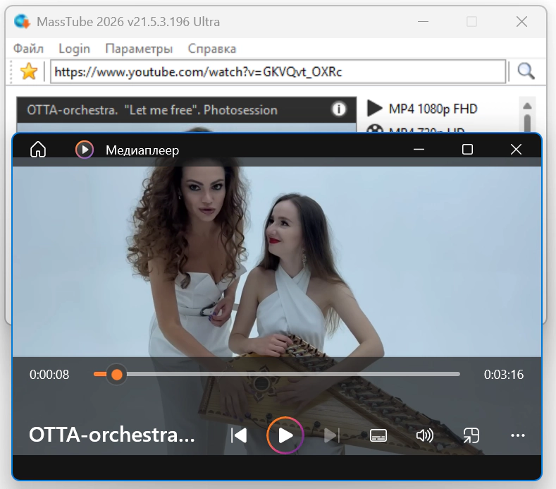 MassTube — очень простая в использовании программа для скачивания видео с YouTube (и не только) с помощью одного клика. Достаточно в строку поиска вставить адрес понравившегося ролика и нажать поиск, после чего программа предоставит список форматов и разрешений, в которых можно быстро скачать данный клип.