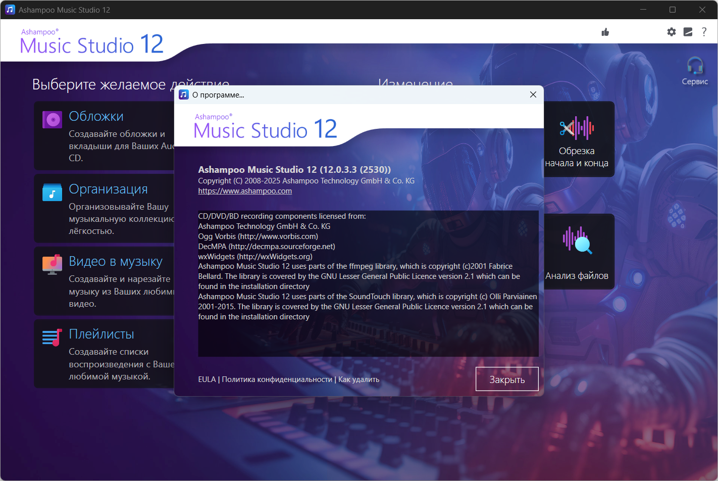 Ashampoo Music Studio 12 - это Швейцарский армейский нож для твоей музыки. Она предлагает обширный набор инструментов для лёгкого редактирования, обработки, нарезки, микширования и организации музыки и аудиофайлов.