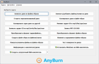 Any Burn - небольшая бесплатная утилита для работы с CD/DVD/Blue-ray дисками. Интерфейс программы достаточно удобен: главное окно представляет собой набор закладок, которые выбираются в зависимости от конкретной задачи. Можно записать на диск готовые образы или отдельные файлы и папки, записать Audio-CD из имеющихся файлов аудиоформата, стереть перезаписываемый диск, создать образ диска или отдельных папок/файлов, скопировать диск и др. операции. Этот инструмент станет неплохой альтернативой существующим платным и "тяжелым" программам по управлению CD/DVD/Blue-ray дисков.