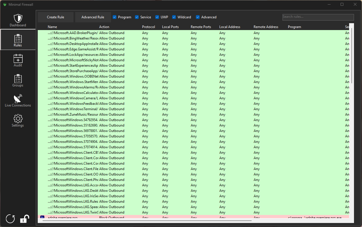 • В отличие от большинства других программ-брандмауэров, Minimal Firewall действует как интерфейс, предотвращая расширение поверхности атаки вашего компьютера за счёт манипуляций с более низкими уровнями WFP. Minimal Firewall также имеет функцию аудита для проверки новых правил, добавленных в брандмауэр Windows. При использовании приложения WFP оно действует как фильтр поверх брандмауэра Windows. Проблема в том, что Microsoft устанавливает различные уровни важности для своих правил брандмауэра (например, правила, изменённые в редакторе групповой политики или связанные с Защитником Windows, могут иметь более высокий уровень важности). Поэтому в случае конфликта фильтра и правил брандмауэра Windows неясно, какое из них имеет приоритет. Minimal Firewall избегает этого, работая напрямую с брандмауэром Windows, не отключая этот ключевой элемент безопасности Windows.
