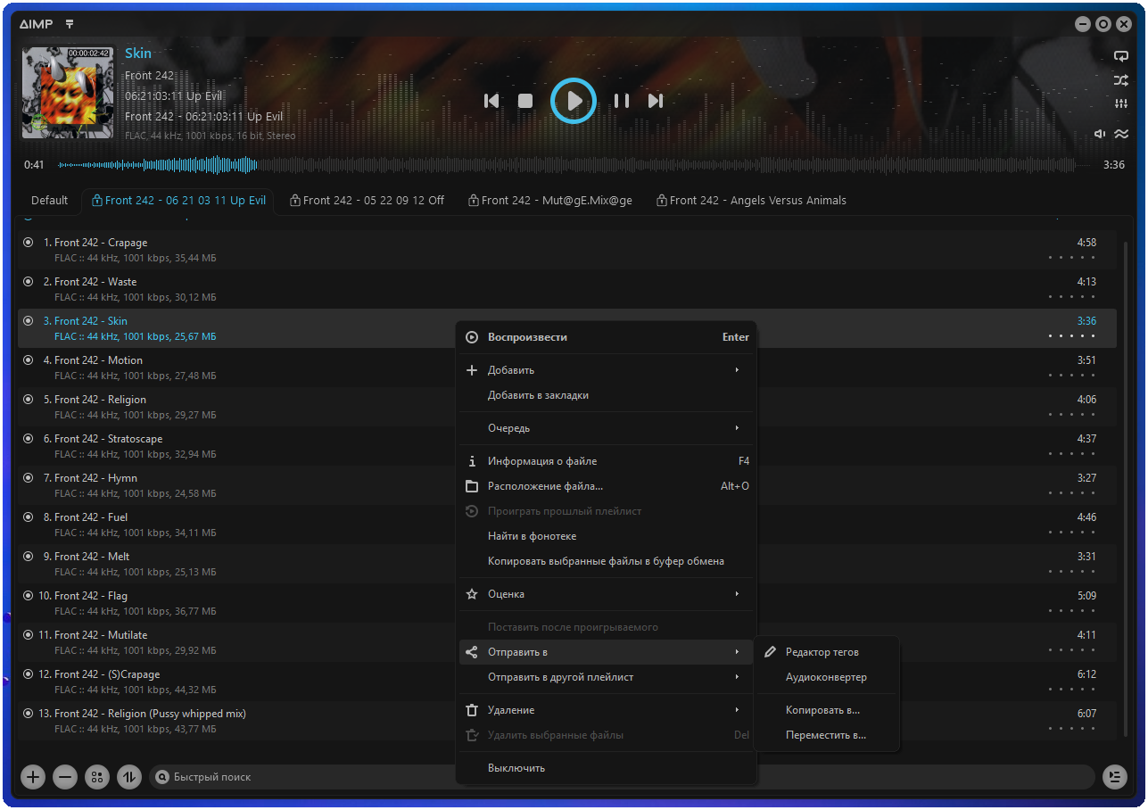 AIMP – проигрыватель, включающий в себя множество дополнительных модулей: CD-Ripper, Tag Editor, Audio-player, аудио конвертер, запись аудио и дисков с данными и т.д. Воспроизводит множество аудиоформатов, включая WAV, MP3, MP2, MP1, OGG, WMA, UMX, не нуждаясь в дополнительных кодеках. Имеет стильный многоязычный интерфейс.