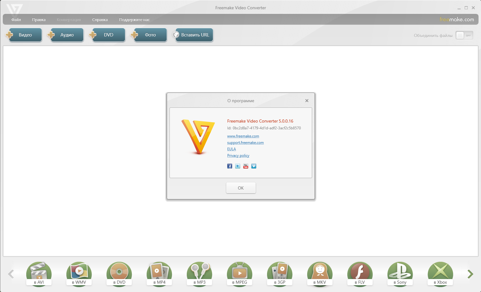 Freemake Video Converter конвертирует видео в таких форматах, как MP4, AVI, MKV, WMV, MP3, DVD, 3GP, SWF, FLV, HD, MOV, RM,QT, Divx, Xvid, TS, Fraps и др. Поддерживаются все современные кодеки: H.264, MKV, MPEG4, AAC. Создавайте видео из аудио и фото. Конвертируйте много файлов одновременно.