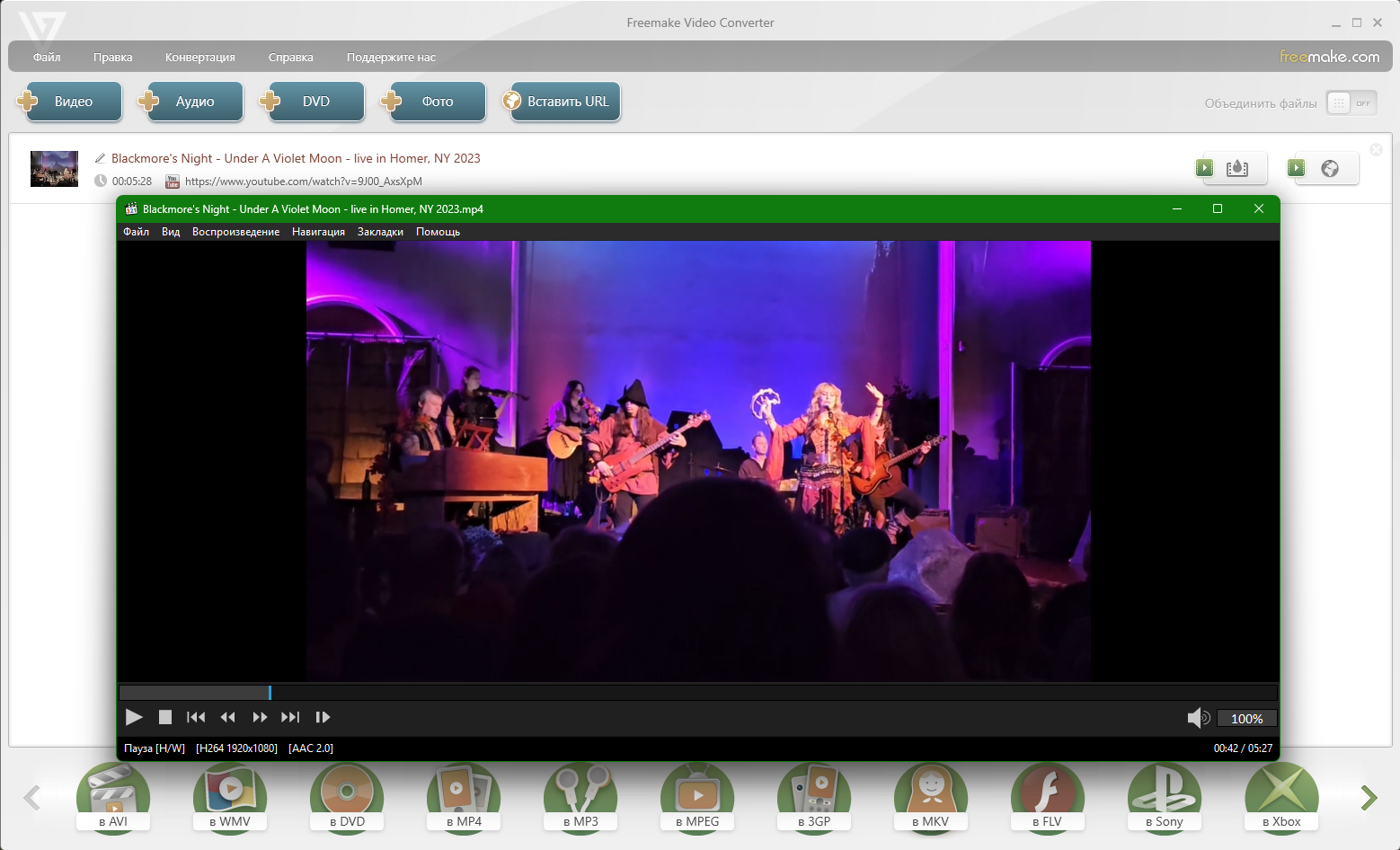 Конвертируйте видео с YouTube, Facebook, Vimeo, VK, Dailymotion. Вы можете сохранить файлы в MP4, AVI, WMV, MKV, DVD форматах или скачать аудио в MP3. Free Video Converter автоматически добавляет готовые видео в iTunes и на устройства Apple. Загружайте видео и фильмы в Full HD качестве.