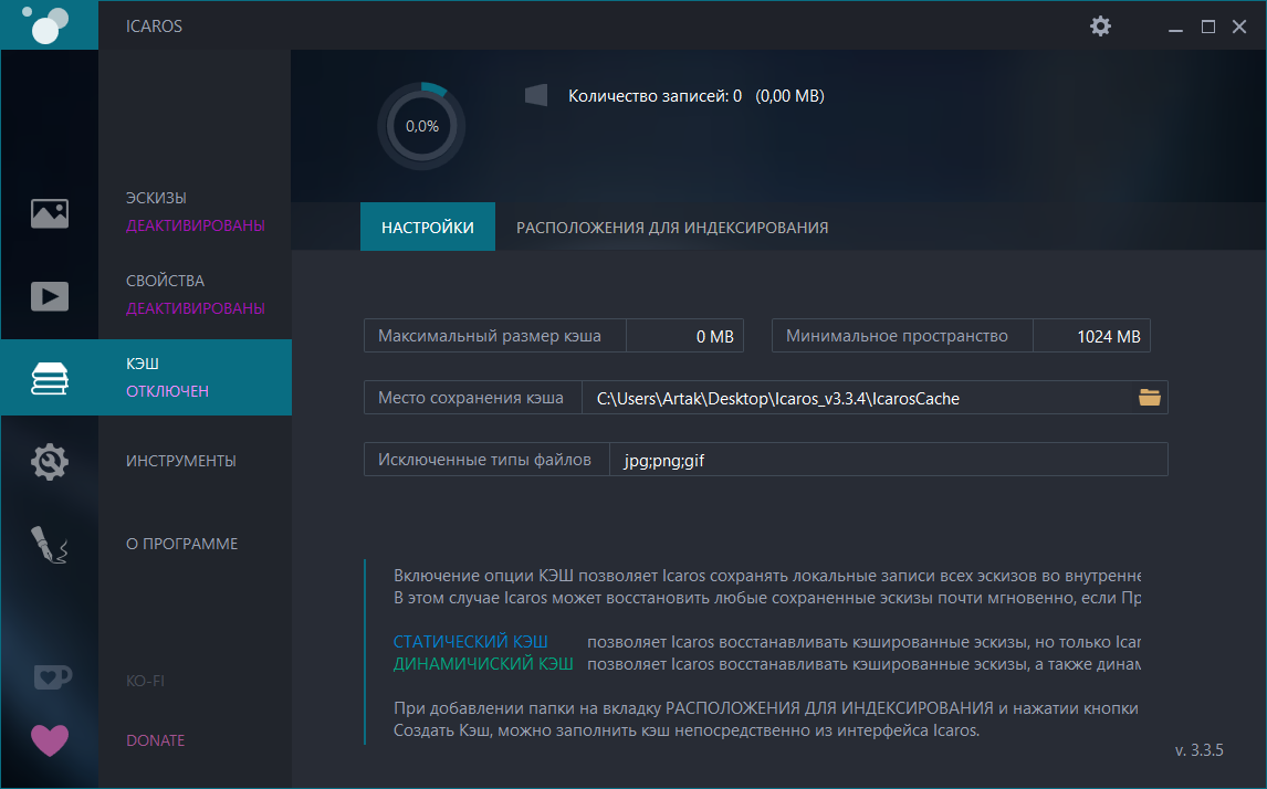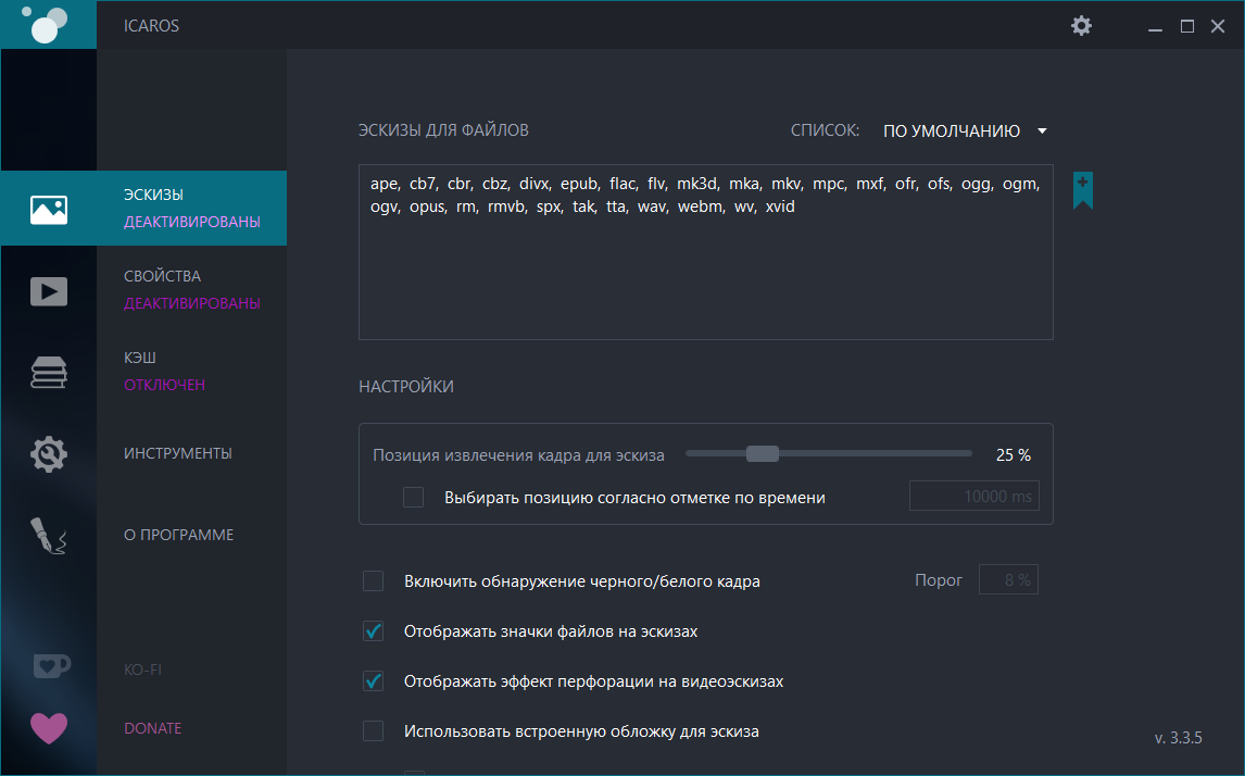• Создание миниатюр и отображение свойств можно активировать или деактивировать. Кэш может быть отключен, включен (статический) или включен (динамический) (подробнее см. раздел «Кэш Icaros» ниже).