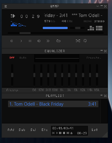 Бесплатный аудиоплеер с простым и удобным интерфейсом, где основные функции реализованы в модульной структуре, а внешне напоминает популярнейший проигрыватель Winamp. Каждый модуль программы доступен для управления, тем самым плеер полностью настраивается "под себя", а при необходимости можно добавить и свои собственные модули. Это относится и к воспроизведению дополнительных форматов, и к отображению новых тем, обложек альбомов и т.д. В целом, Qmmp, написанный с использованием библиотеки Qt, легко заменяет стандартные и менее "гибкие" аудиоплееры.