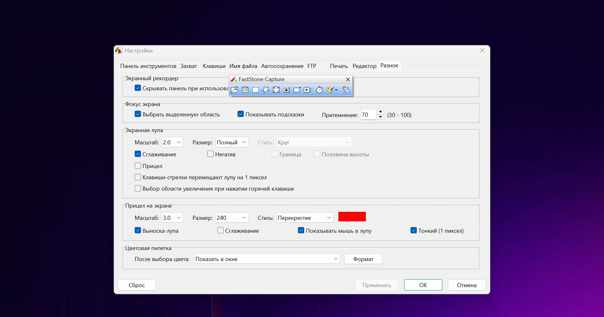 FastStone Capture представляет собой довольно мощное, но в то же время простое средство для захвата снимков с рабочего стола Windows. Позволяет захватывать как отдельные элементы, окна, части рабочего пространства, так и полный экран (поддерживается прокрутка страниц). Оснащена небольшой панелью для манипуляций с изображениями. Кроме того, имеются в наличии такие элементы, как экранная лупа, пипетка и линейка, что делает программу ещё более универсальной.