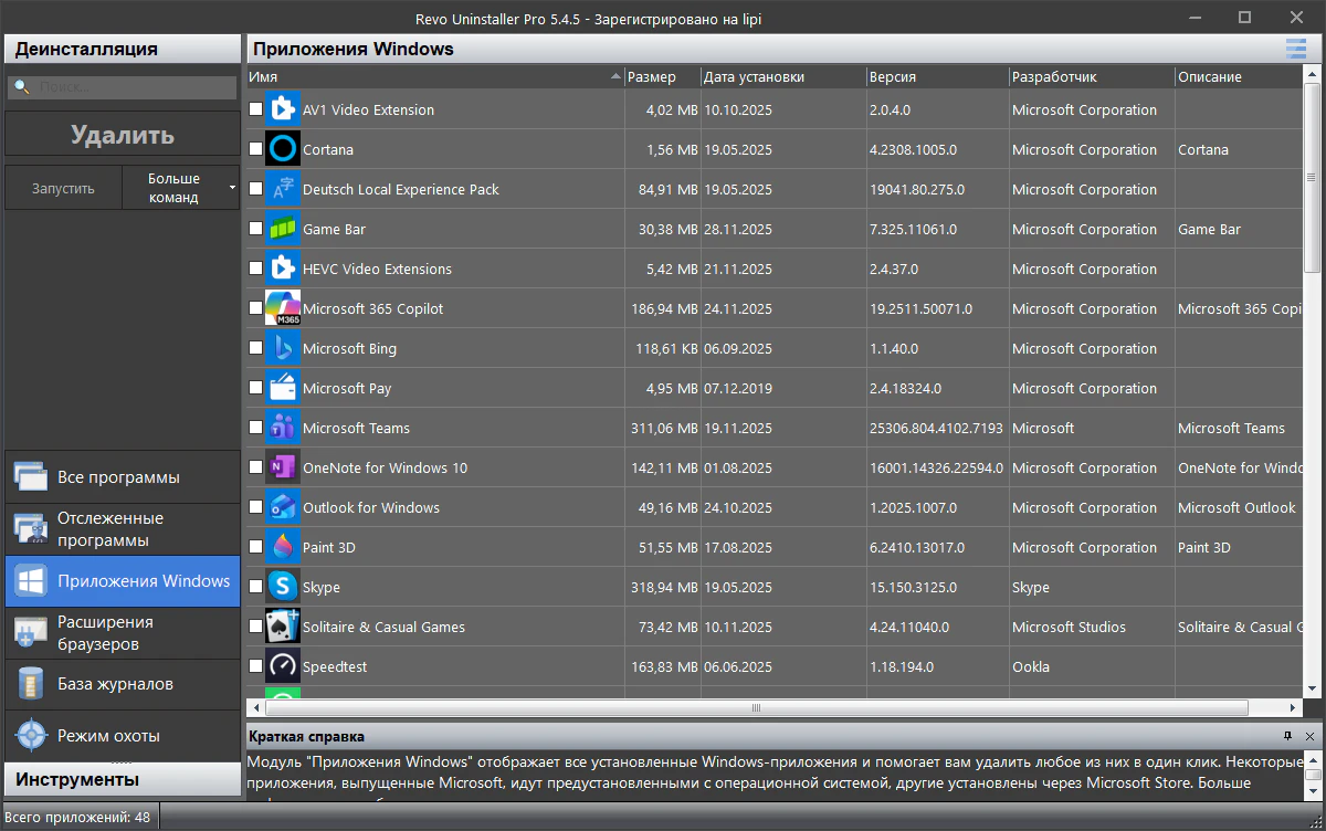 Приложения Windows, которые интегрированы в большинство версий Windows, также можно удалять с помощью Revo Uninstaller Pro. Все приложения (которые предустановлены в Windows или устанавливаются позже пользователем) перечисляются отдельно в специальном модуле, который обеспечивают лучшую организацию.