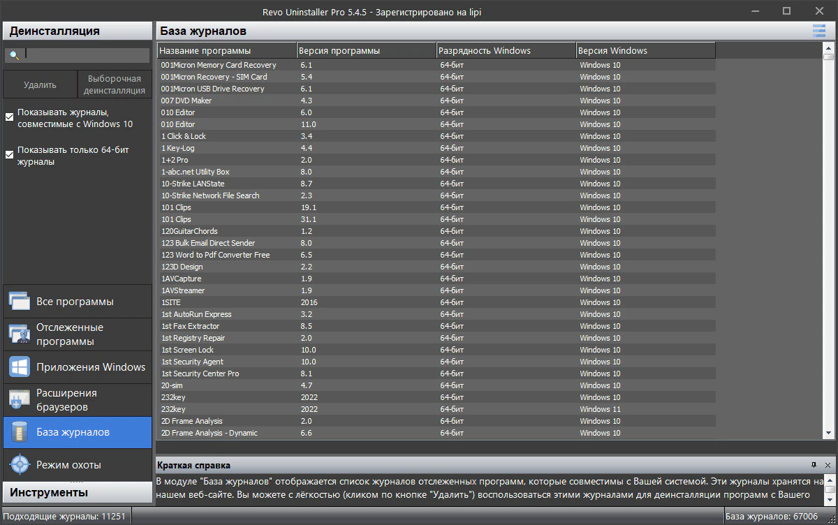 База данных журналов Revo Uninstaller Pro - это большая коллекция записей о работе различных программ. Эти журналы были созданы нашей командой с помощью функции Мониторинга в реальном времени и хранятся на нашем сервере. Они работают как записи, которые пользователи могут создавать самостоятельно, и позволяют удалять программы или проводить дополнительную очистку остатков если есть сомнения или для устранения ошибок.