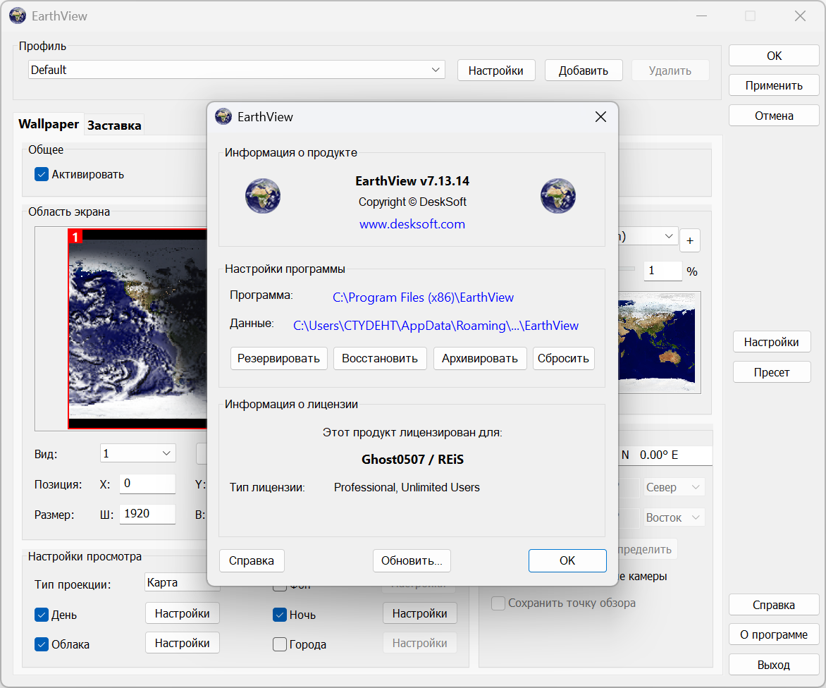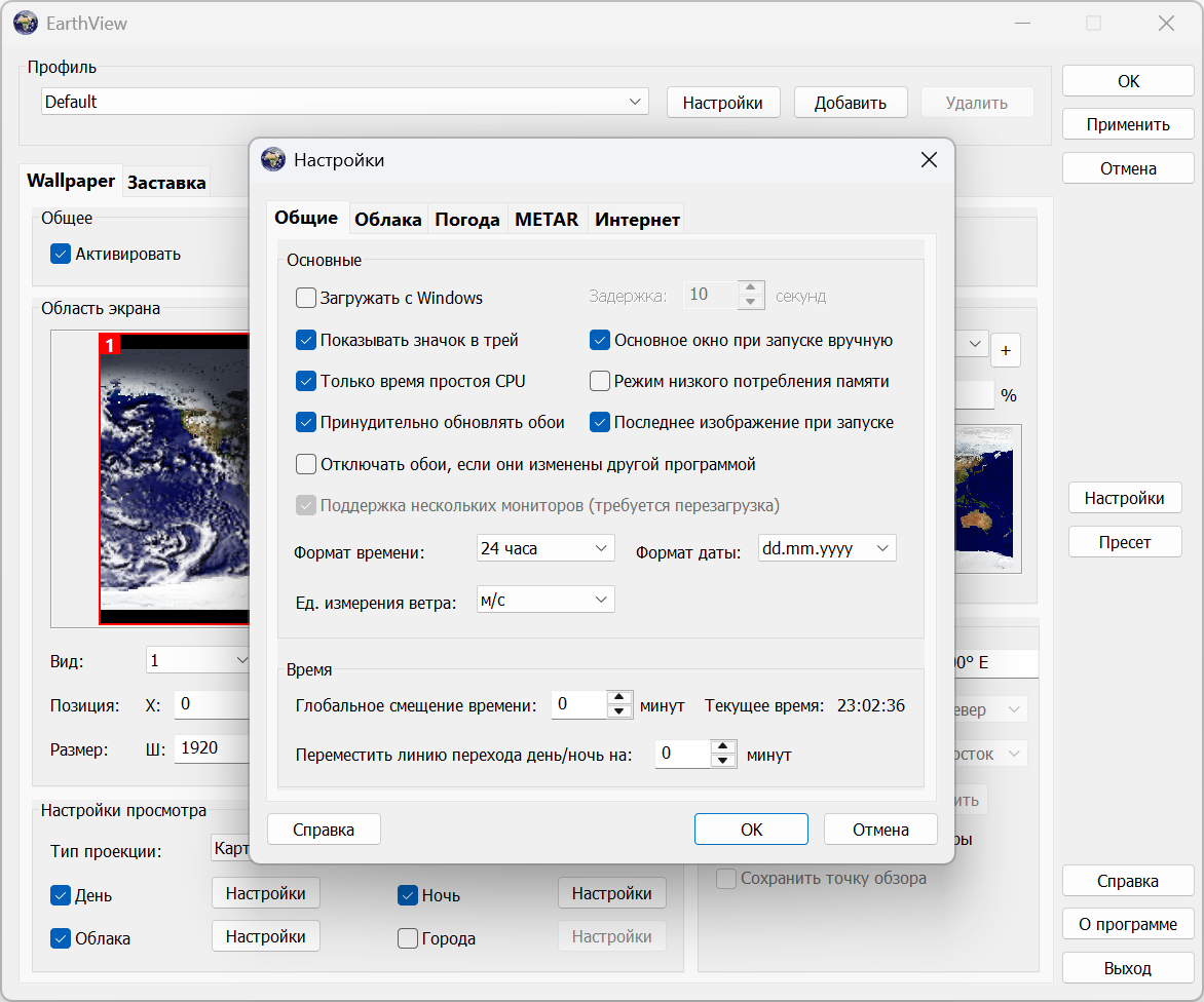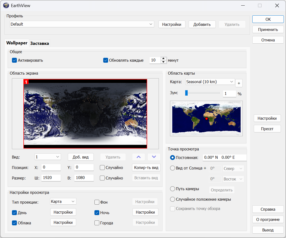 EarthView — это динамические обои для рабочего стола и хранитель экрана, которые отображают прекрасные виды земли с дневным светом и ночными тенями. Он создает красочные, высококачественные изображения с высоким разрешением для любого разрешения экрана — даже выше 3840x2160! Программа поддерживает виды карты и земного шара, городские районы, городские огни, атмосферные эффекты, облака, информацию о погоде, отображение местного времени и многое другое. EarthView поддерживает различные карты, по-разному отображающие нашу планету Земля, включая сезонные изменения растительности, снежного покрова и океанского льда. Многие опции позволяют полностью настроить все параметры просмотра. EarthView получил бесчисленное количество наград за абсолютно захватывающие изображения.
