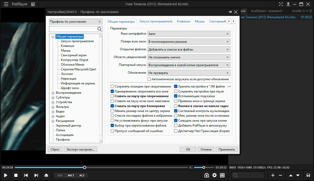 1) закрывает PotPlayer и движок ace engine, если уже запущены (для предотвращения дублирования процессов)