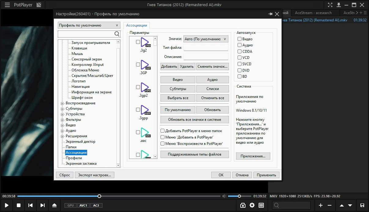 7. Возможность ассоциации плеера только с основными типами видео-файлов или
