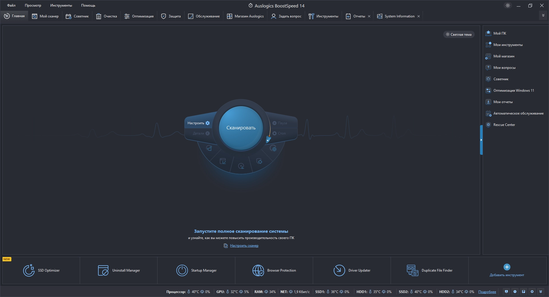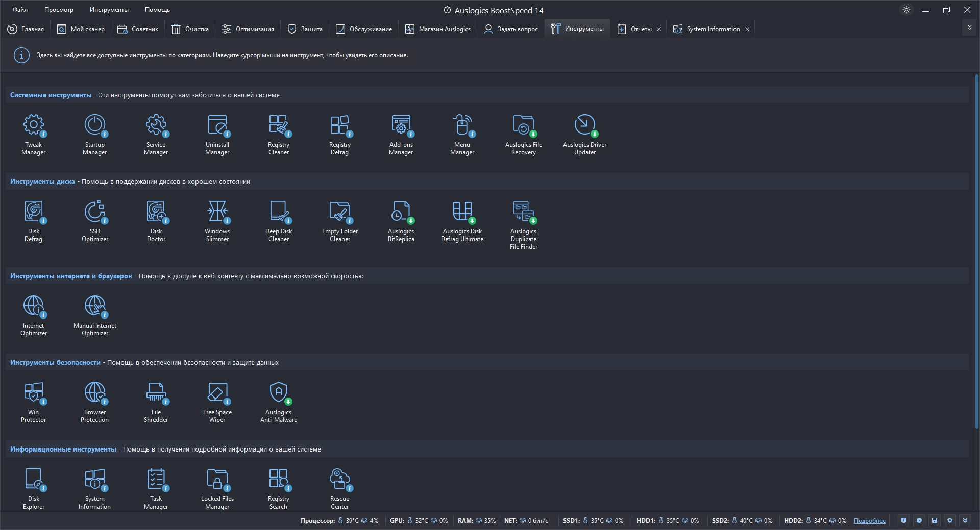 Auslogics BoostSpeed - популярный набор инструментов для оптимизации и настройки вашей операционной системы. С помощью этой программы вы сможете значительно оптимизировать работу вашей системы, с легкостью настроить различные параметры Windows, очистить жесткий диск и системный реестр от мусора и ненужных записей, сделать дефрагментацию дисков и реестра, а также оптимизировать скорость интернет-соединения и многое другое.