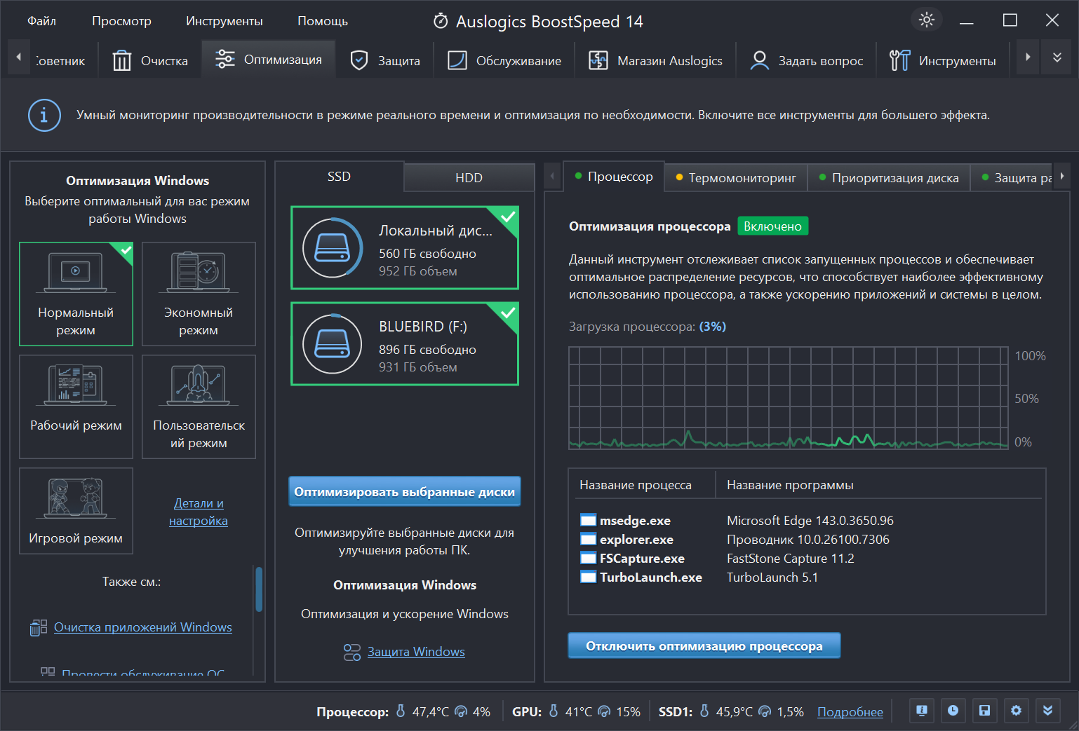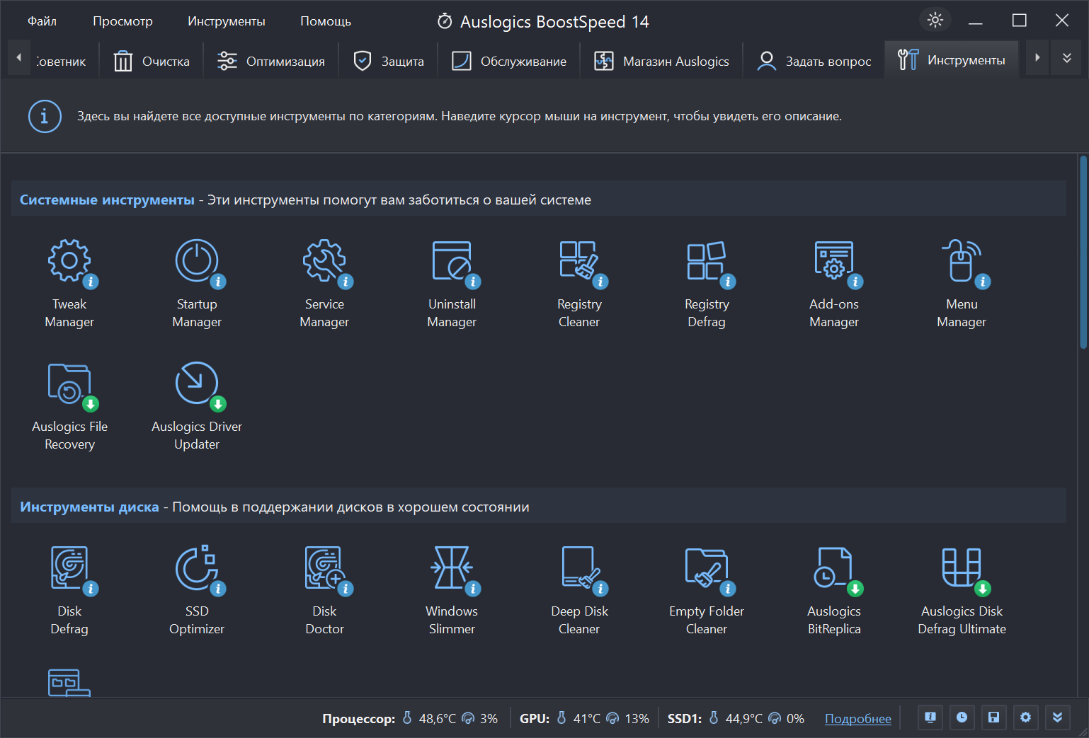 Auslogics BoostSpeed - популярный набор инструментов для оптимизации и настройки вашей операционной системы. С помощью этой программы вы сможете значительно оптимизировать работу вашей системы, с легкостью настроить различные параметры Windows, очистить жесткий диск и системный реестр от мусора и ненужных записей, сделать дефрагментацию дисков и реестра, а также оптимизировать скорость интернет-соединения и многое другое.