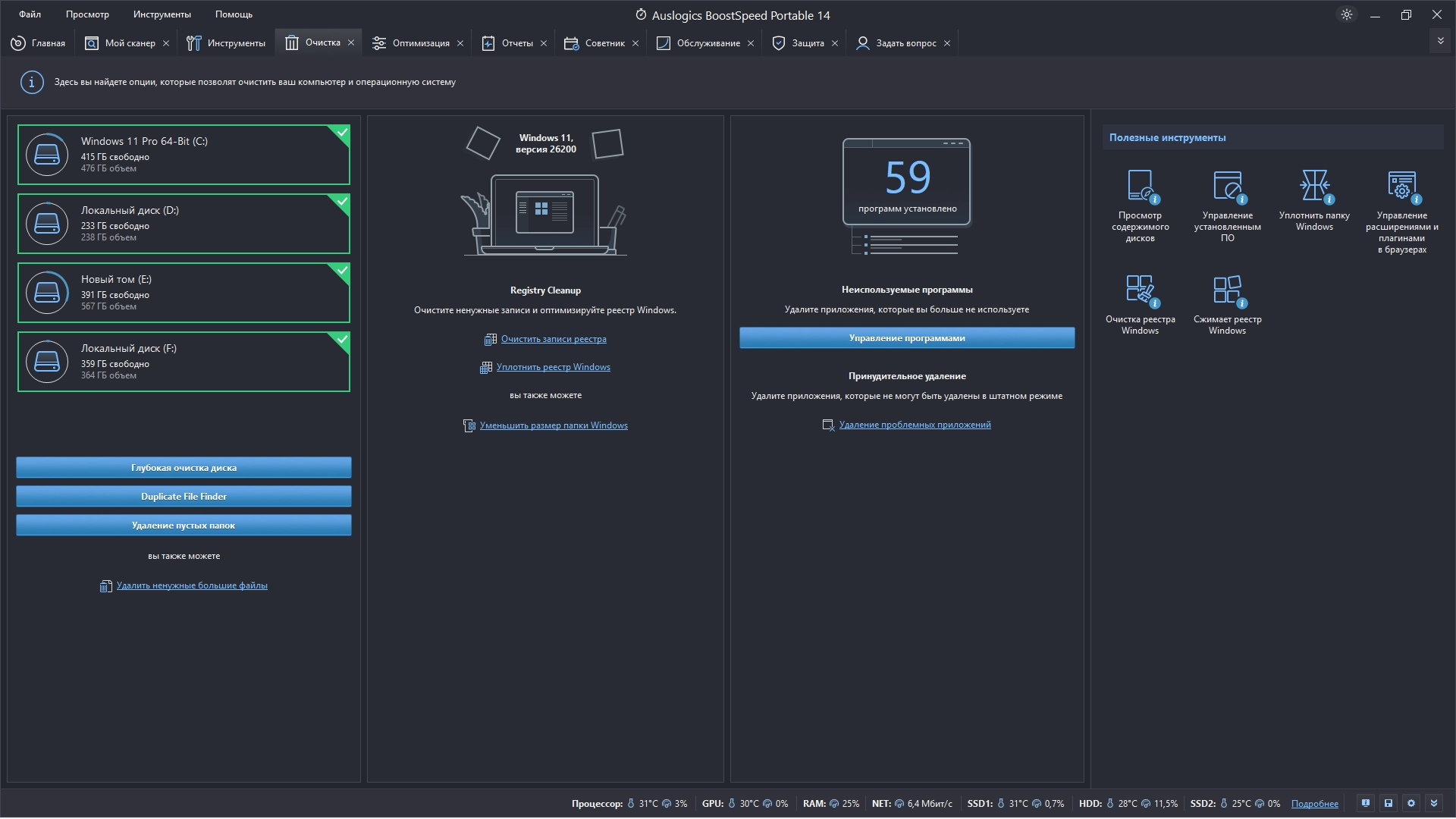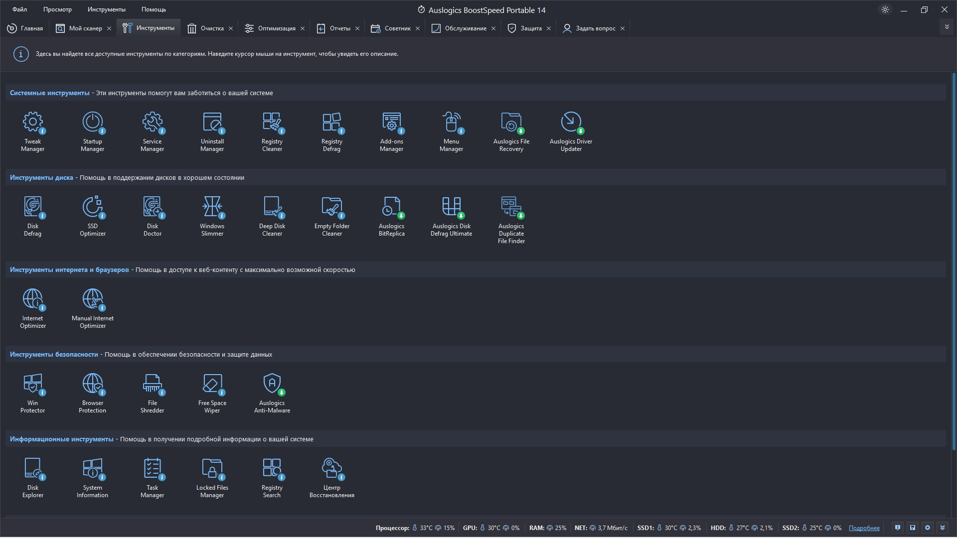 Auslogics BoostSpeed - популярный набор инструментов для оптимизации и настройки вашей операционной системы. С помощью этой программы вы сможете значительно оптимизировать работу вашей системы, с легкостью настроить различные параметры Windows, очистить жесткий диск и системный реестр от мусора и ненужных записей, сделать дефрагментацию дисков и реестра, а также оптимизировать скорость интернет-соединения и многое другое.