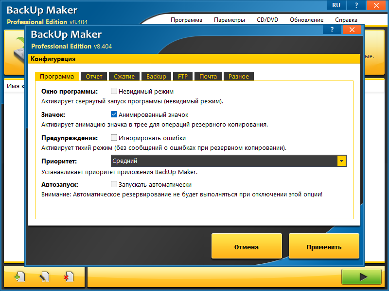 Резервные копии данных BackUp Maker может отправлять на хранение на FTP-сервер, сетевой компьютер или внешний USB-накопитель (диск или флешку). Более того, она позволяет записывать бэкапы на CD\DVD диски с возможность разделения одного бэкапа на несколько дисков.