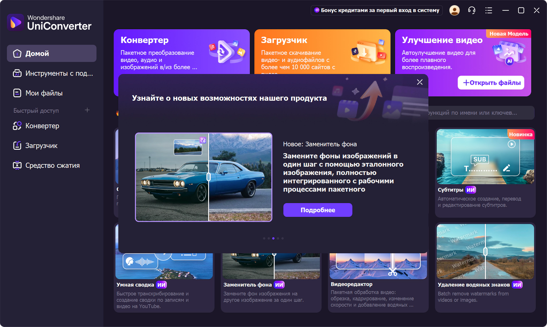 Wondershare UniConverter - простой в использовании видеоконвертер, с помощью которого вы легко можете конвертировать, редактировать, увеличивать, скачивать, записывать на диск, организовывать, захватывать видеосигнал и просматривать в более чем 159 форматах. Наслаждайтесь последним дополнением к VCU в новом видеоформате 4K! Ощутите с помощью 4K лучшее и непревзойдённое на сегодняшний день качество изображения! Конвертируйте видео в 1000 форматов с 30-кратной скоростью без потери качества. Быстрая конвертация, высокое качество работы и другие дополнительные функции делают данный видеоконвертер совершенным. Wondershare UniConverter также предлагает полный набор оптимизированных видео инструментов, которые вам непременно пригодятся. Программа имеет простой в использовании и приятный интерфейс.