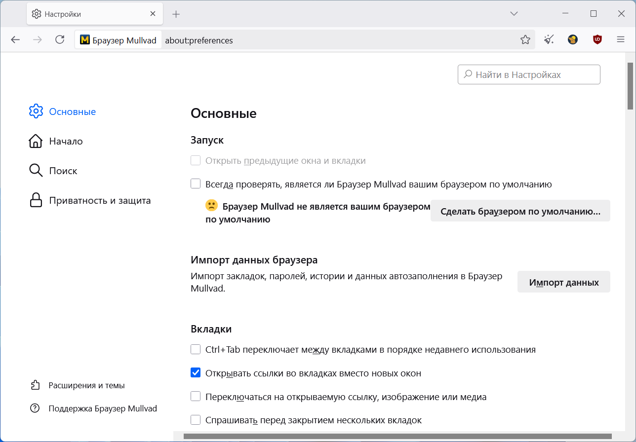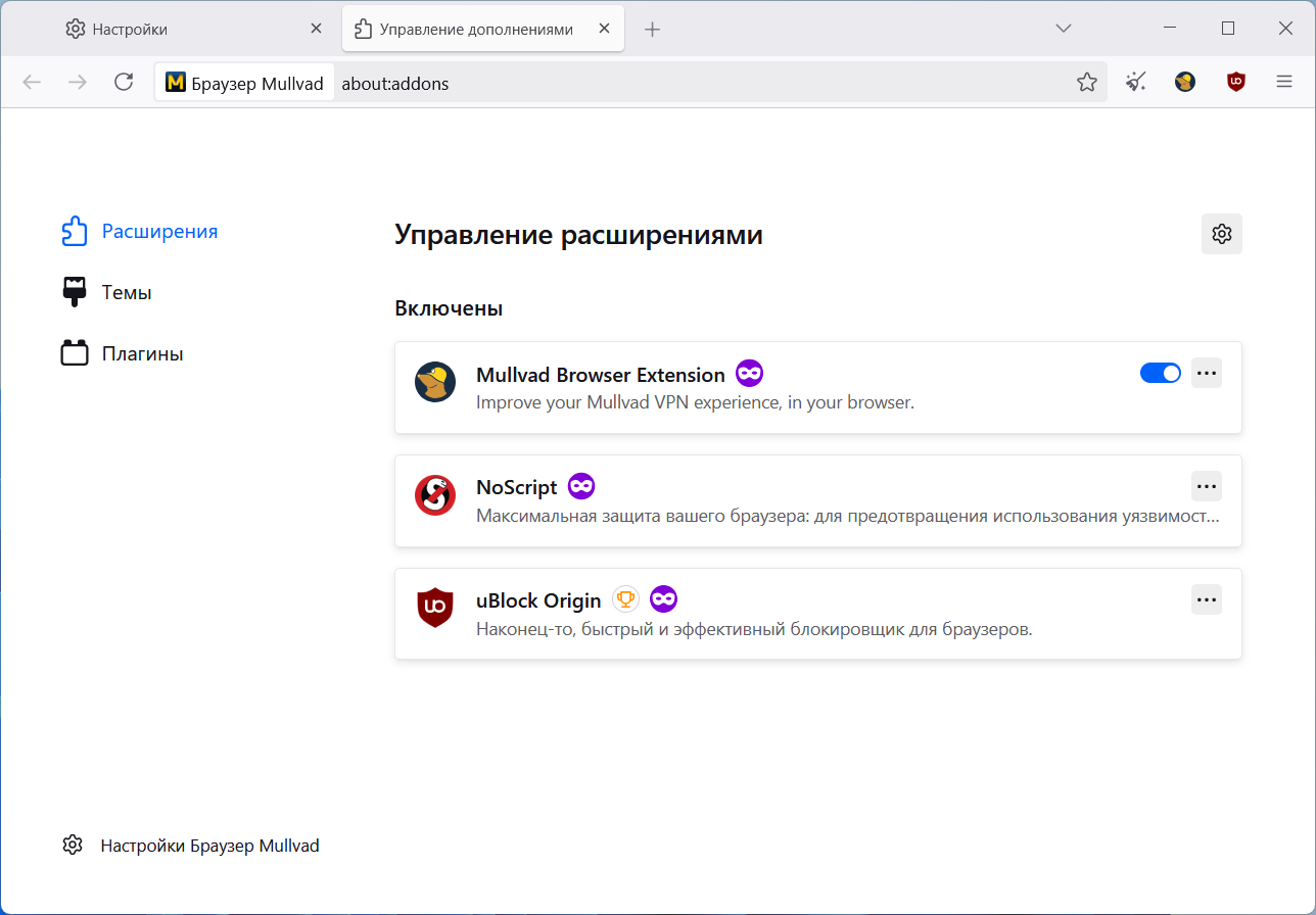 • Интегрированы дополнения uBlock Origin и Mullvad Browser Extension.