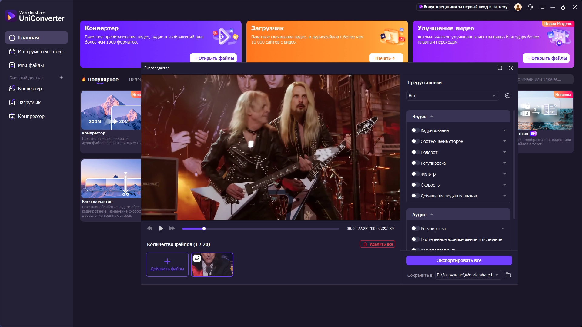 Wondershare UniConverter - простой в использовании видеоконвертер, с помощью которого вы легко можете конвертировать, редактировать, увеличивать, скачивать, записывать на диск, организовывать, захватывать видеосигнал и просматривать в более чем 159 форматах. Наслаждайтесь последним дополнением к VCU в новом видеоформате 4K! Ощутите с помощью 4K лучшее и непревзойдённое на сегодняшний день качество изображения! Конвертируйте видео в 1000 форматов с 30-кратной скоростью без потери качества. Быстрая конвертация, высокое качество работы и другие дополнительные функции делают данный видеоконвертер совершенным. Wondershare UniConverter также предлагает полный набор оптимизированных видео инструментов, которые вам непременно пригодятся. Программа имеет простой в использовании и приятный интерфейс.