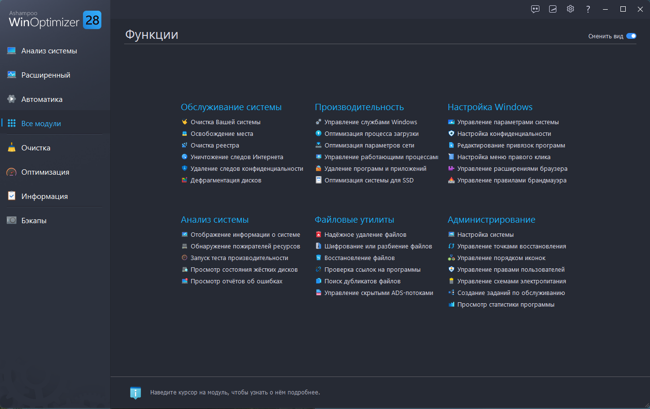 В новую версию WinOptimizer добавлены подсказки к различным областям программы, чтобы развеять туман заблуждений и наставить Вас на путь к идеальной системе. Просто наведите мышь на функцию и подождите две секунды, чтобы получить помощь или дополнительную информацию. И не забудьте развернуть окно на весь экран, чтобы увидеть ещё больше подробностей и панелей с информацией на главной странице! Больше предпочитаете определять модули в соответствии с выполнимыми задачами? Используйте переключатель и переходите от названий модулей к категориям задач в разделе «Все модули».