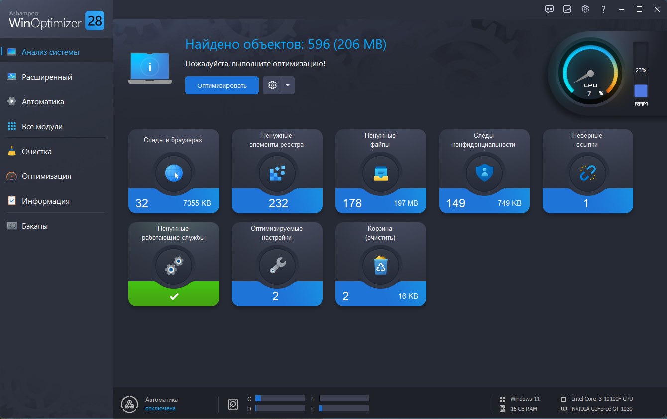 Вы сразу же почувствуете невероятную силу оптимизации Ashampoo® WinOptimizer! Позаботьтесь о восьми основных проблемных областях Windows всего одним кликом и заставьте систему работать в полную силу! Избавьтесь от мусора, такого как следы работы в Интернете, исправьте записи в реестре, удаляйте битые ссылки и отключайте ненужные службы – всесторонний анализ системы, встроенный в WinOptimizer, сделает Вашу машину быстрее, чище и безопаснее. Оптимизируйте параметры безопасности, системы и автозапуска и очищайте корзину всего одним кликом! Освобождайте ресурсы системы и наслаждайтесь быстрым временем запуска и плавной работой Windows благодаря большему объёму свободной памяти.