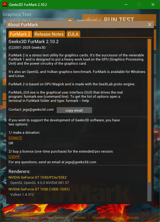 FurMark 2 является преемником почтенного FurMark 1.. и представляет собой очень интенсивный стресс-тест графического процессора. Это также быстрый графический тест OpenGL и Vulkan с онлайн-оценками. FurMark 2 имеет улучшенную поддержку командной строки и создан с помощью GeeXLab.