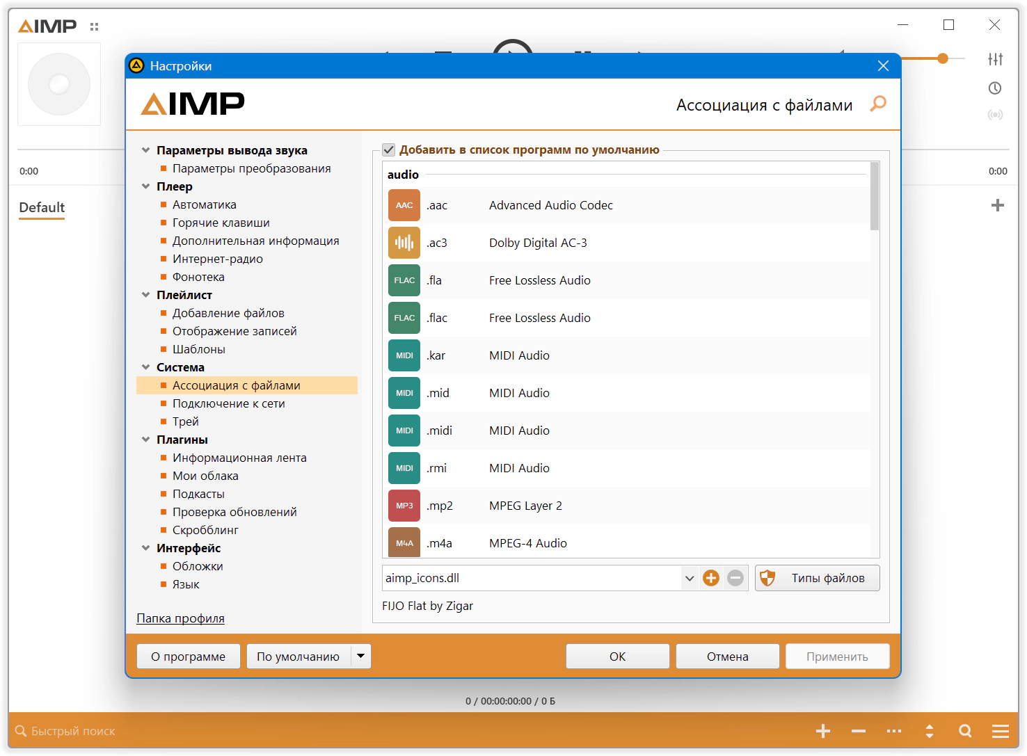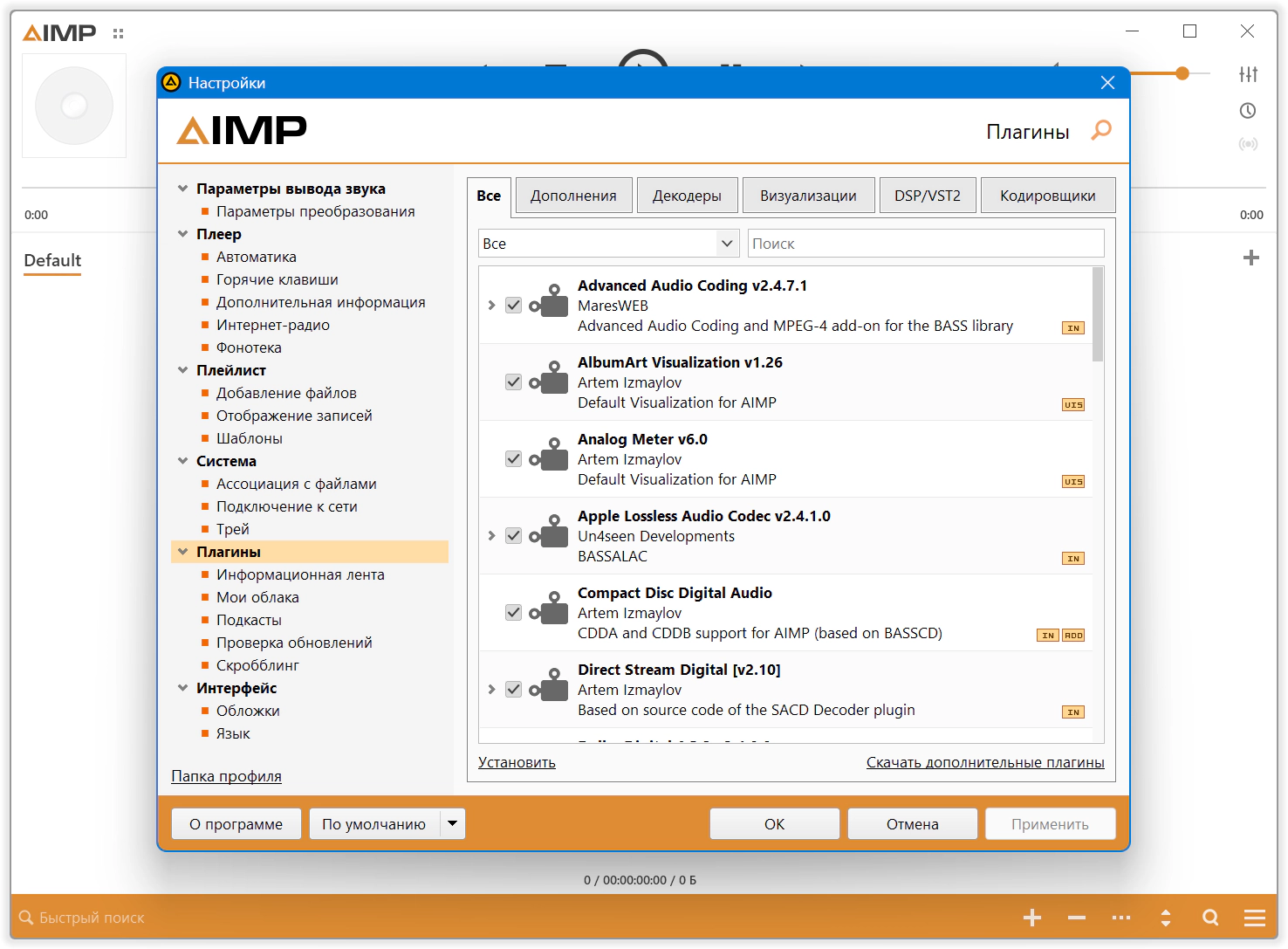 Проигрывает большое количество современных популярных форматов. Плеер потребляет самый минимум системных ресурсов, система его просто не замечает, но при этом мгновенно работает с плейлистами и радует своей скоростью работы, даже если сравнивать его с платными аналогичными продуктами. Радует AIMP не только скоростью работы, но и очень красивым дизайном, который настраивается на любой вкус и цвет. Новая версия поменяла полностью интерфейс по умолчанию, полностью оказавшись от привычного старого. Но, естественно, в случае если пользователя не устроит концепция нового дизайна, то он всегда сможет загрузить обложки по своему вкусу с официального сайта плеера, доступного непосредственно из интерфейса AIMP. Интерфейс полностью на русском языке с поддержкой других, куча дополнительных функций, возможность настроить частоту с помощью эквалайзера, различные специальные эффекты, визуализации, поддержка плагинов, которая существенно расширит возможности плеера, редактор тегов, библиотека и так далее.
