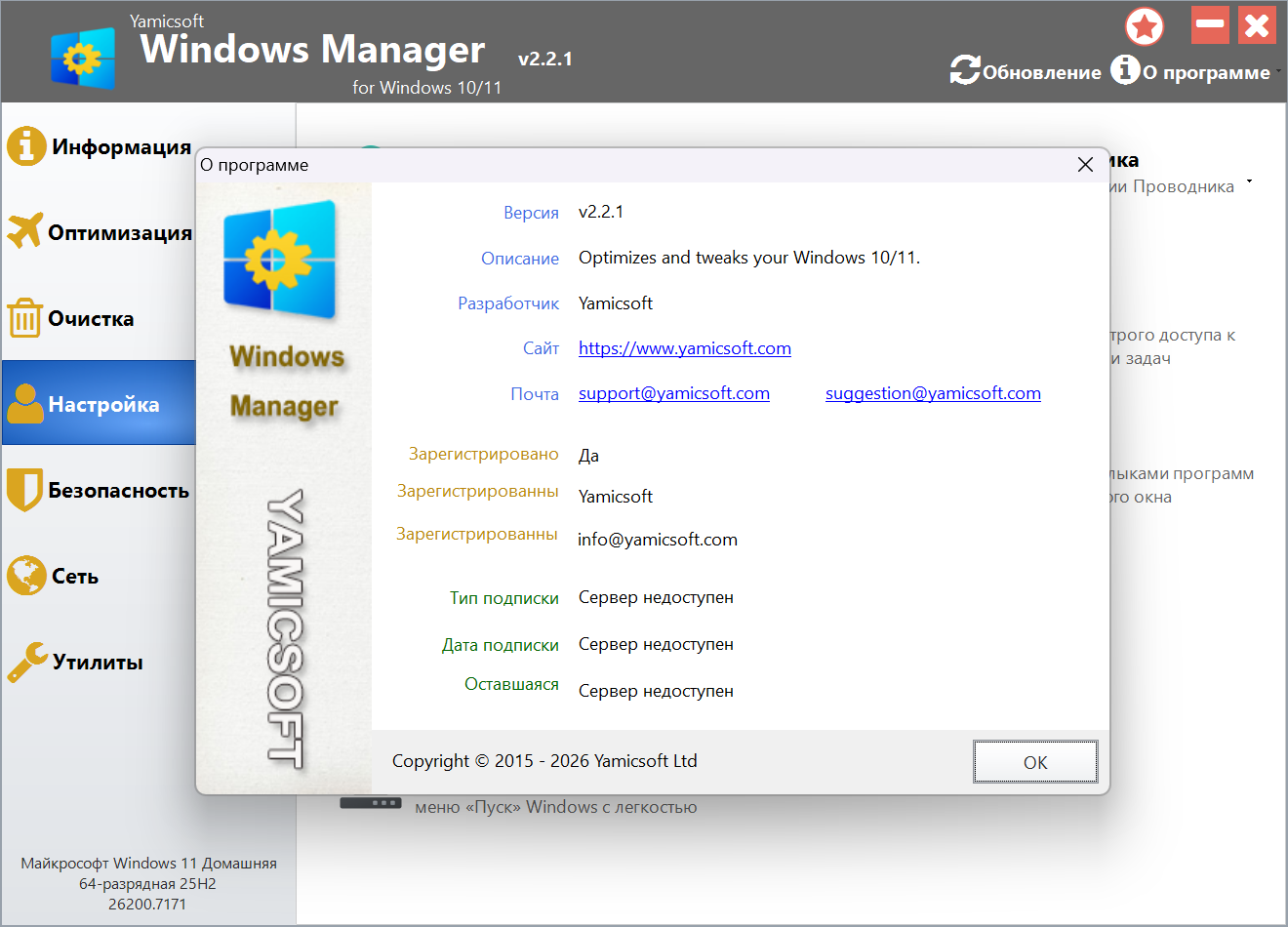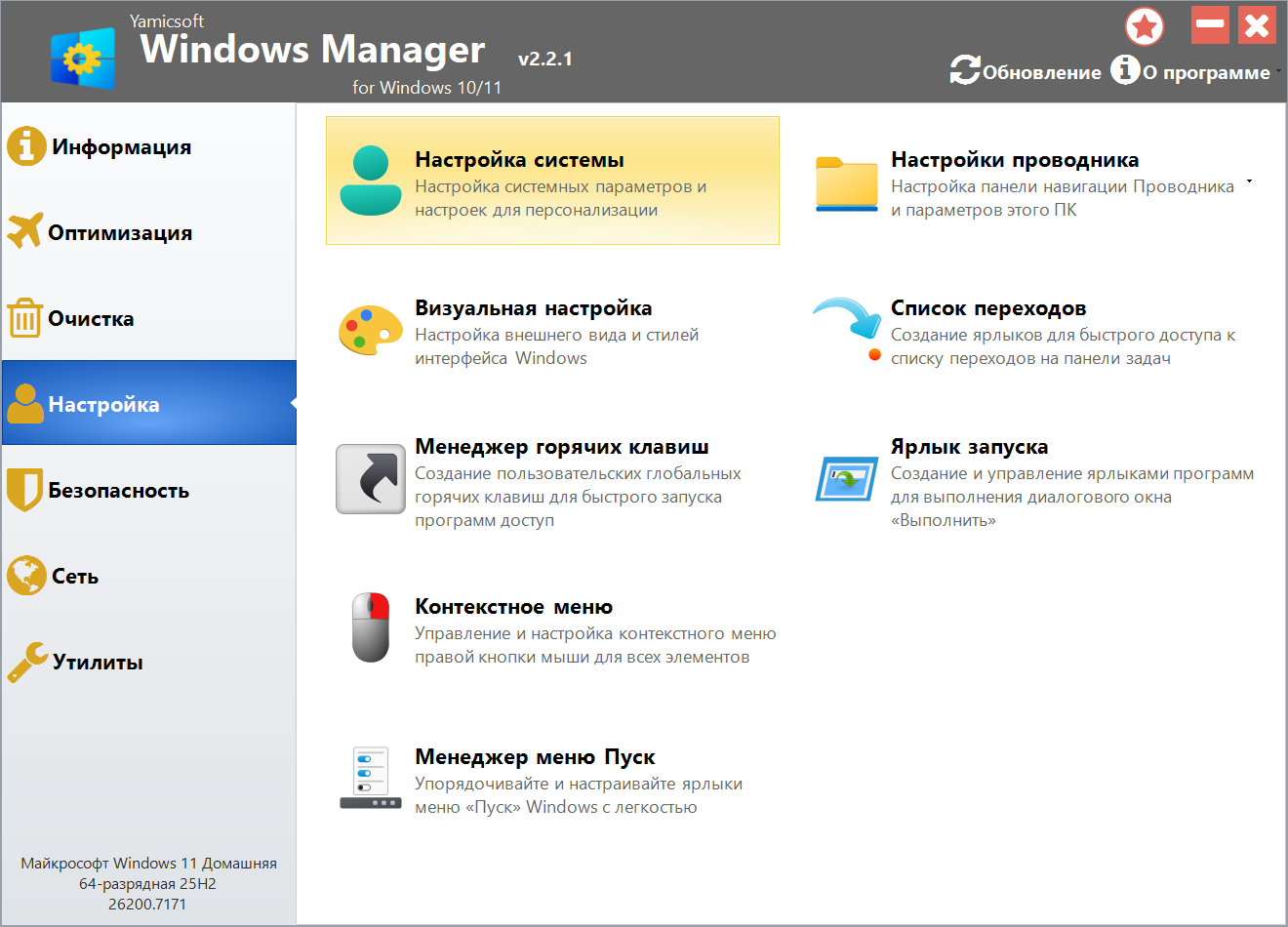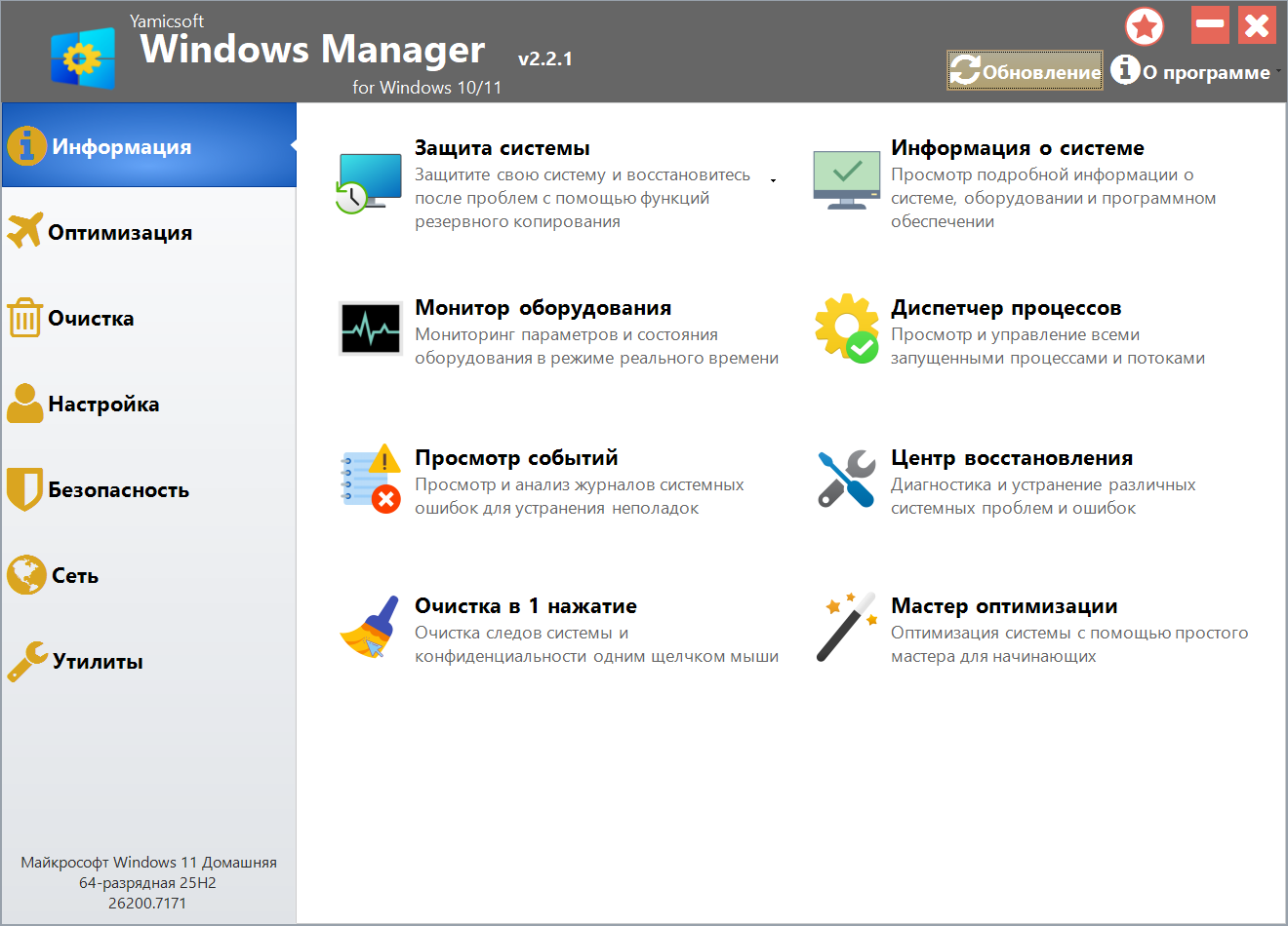 Windows Manager - это универсальная утилита для Microsoft Windows 10/11, включающая в себя более сорока различных утилит для оптимизации, настройки, очистки, ускорения и ремонта Windows 10/11, помогающая ускорить работу системы, устранить системные ошибки, повысить стабильность и безопасность, персонализировать вашу копию Windows 10/11 и оправдать все ваши ожидания.