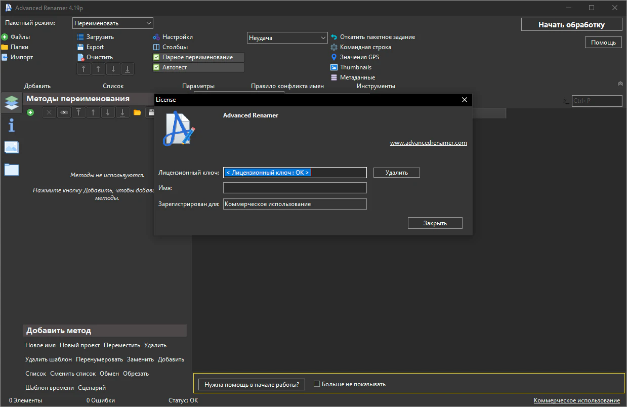 2. Скопировать в папку установленного ПО из папки crack файл advanced.renamer.personal.4.19-patch.exe или advanced.renamer.commercial.4.19-patch.exe в зависимости от предпочитаемой вами лицензии. (Патчи от Алексея Попова)