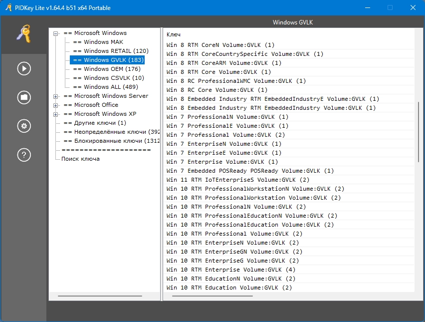 Она позволяет заменить PIDKey by Ratiborus, Ultimate PID Checker by janek2012 и VAMT. Программа PIDKey Lite является правопреемницей PIDKey и взяла из нее лучшие идеи. Основной особенностью программы является создание SQL-базы в отличие от PIDKey, где база фактически хранилась в текстовых файлах. Программа позволяет добавлять новые ключи в двух режимах (режимы добавления ключей будут описаны ниже) и проверять их, находить в базе нужные ключи, обновлять информацию о них и (или) перемещать их в блокированные.