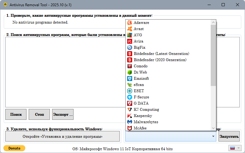 Antivirus Removal Tool включает официальные утилиты для удаления антивирусов: