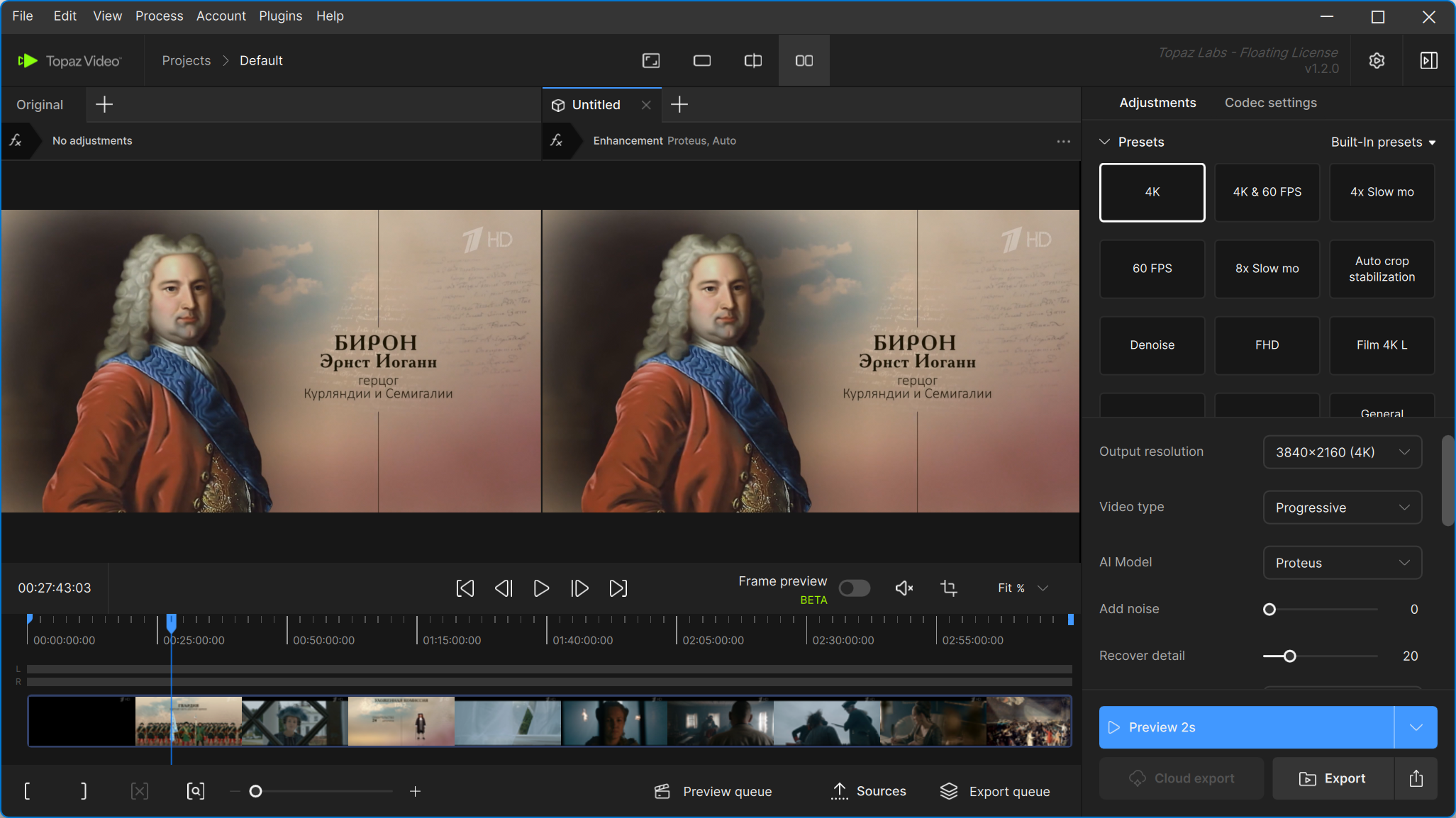 Topaz Video – это профессиональное программное обеспечение для улучшения видео на базе искусственного интеллекта, которое позволяет удалять шум из видео, снятого при слабом освещении, восстанавливать и повышать разрешение старых архивных видео до 4K, восстанавливать фокус и регулировать частоту кадров, создавая новые кадры буквально из воздуха.