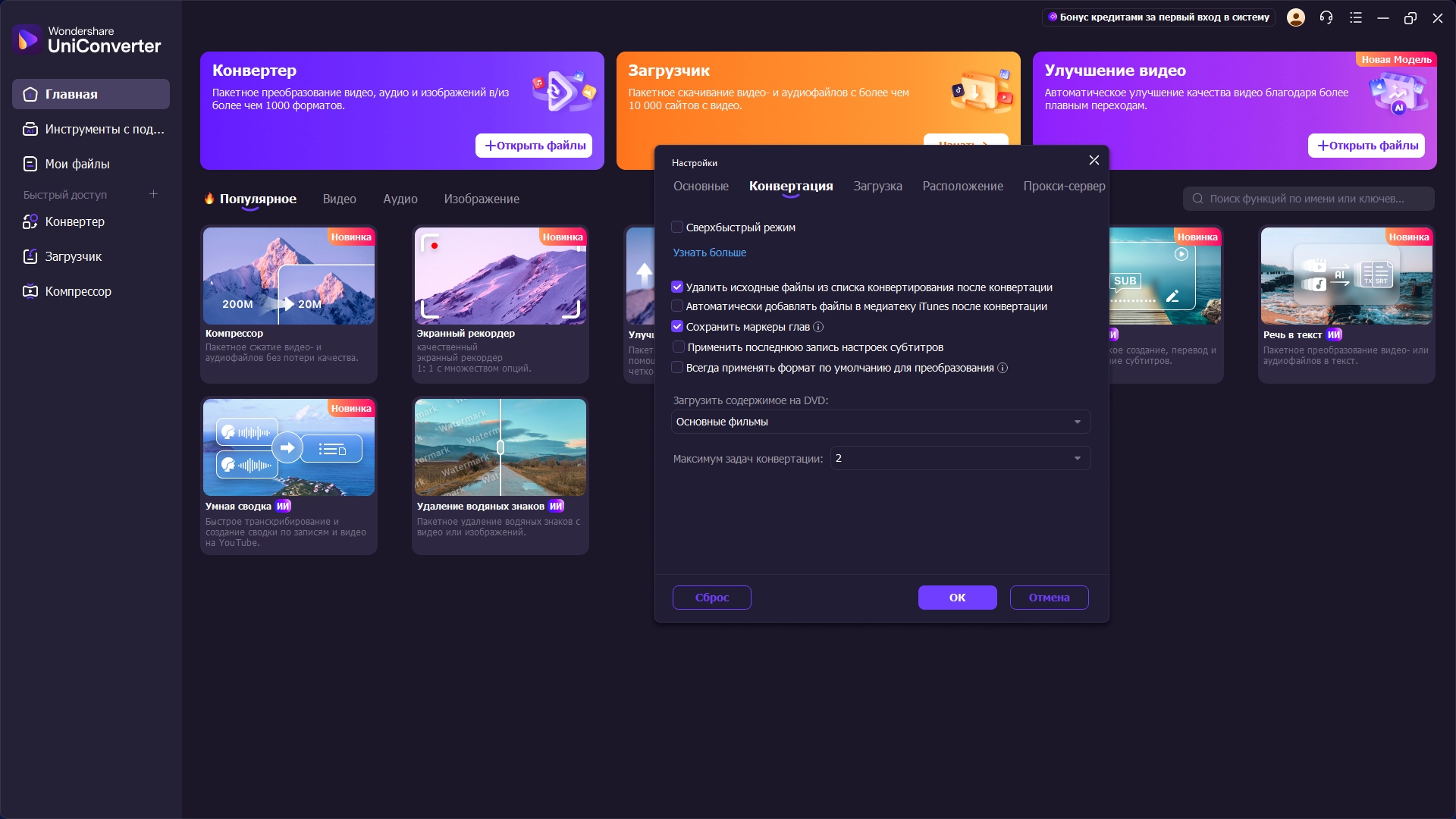 Wondershare UniConverter - простой в использовании видеоконвертер, с помощью которого вы легко можете конвертировать, редактировать, увеличивать, скачивать, записывать на диск, организовывать, захватывать видеосигнал и просматривать в более чем 159 форматах. Наслаждайтесь последним дополнением к VCU в новом видеоформате 4K! Ощутите с помощью 4K лучшее и непревзойдённое на сегодняшний день качество изображения! Конвертируйте видео в 1000 форматов с 30-кратной скоростью без потери качества. Быстрая конвертация, высокое качество работы и другие дополнительные функции делают данный видеоконвертер совершенным. Wondershare UniConverter также предлагает полный набор оптимизированных видео инструментов, которые вам непременно пригодятся. Программа имеет простой в использовании и приятный интерфейс.
