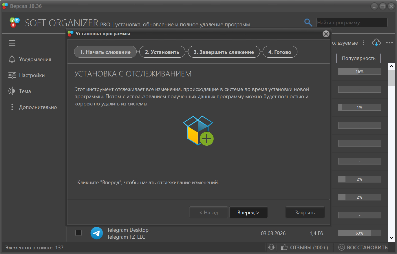 Soft Organizer работает быстрее многих утилит подобной тематики. Это происходит за счет того, что при отслеживании изменений, вносимых программами установки, изменения на дисках анализируются в реальном времени, не прибегая к длительному сохранению сведений обо всех файлах до и после установки, как это делают другие похожие утилиты.