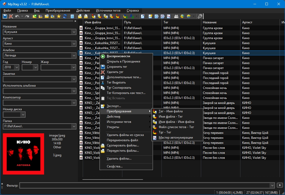 MP3tag без проблем может править мультимедийные файлы как в одиночном, так и пакетном режиме. Умеет автоматически производить обновления тегов, обложек альбомов, которые встроены в них, а также обновлять их с помощью онлайн ресурсов freedb, Amazon или Discogs.