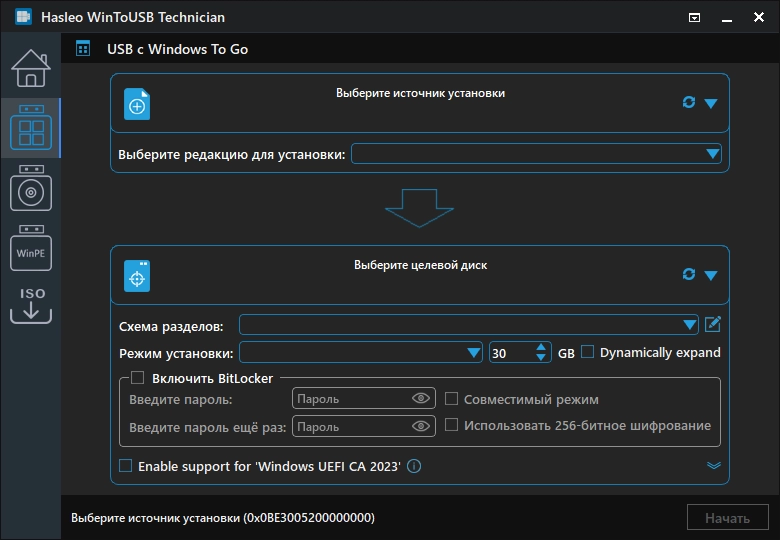 WinToUSB - позволяет устанавливать и запускать операционную систему Windows с USB-HDD или USB-Flash, используя образ ISO или CD/DVD диск в качестве источника установки. WinToUSB также поддерживает создание загрузочного WinPE USB, он может помочь вам перенести содержимое WinPE на диск USB и сделать накопитель загрузочным.