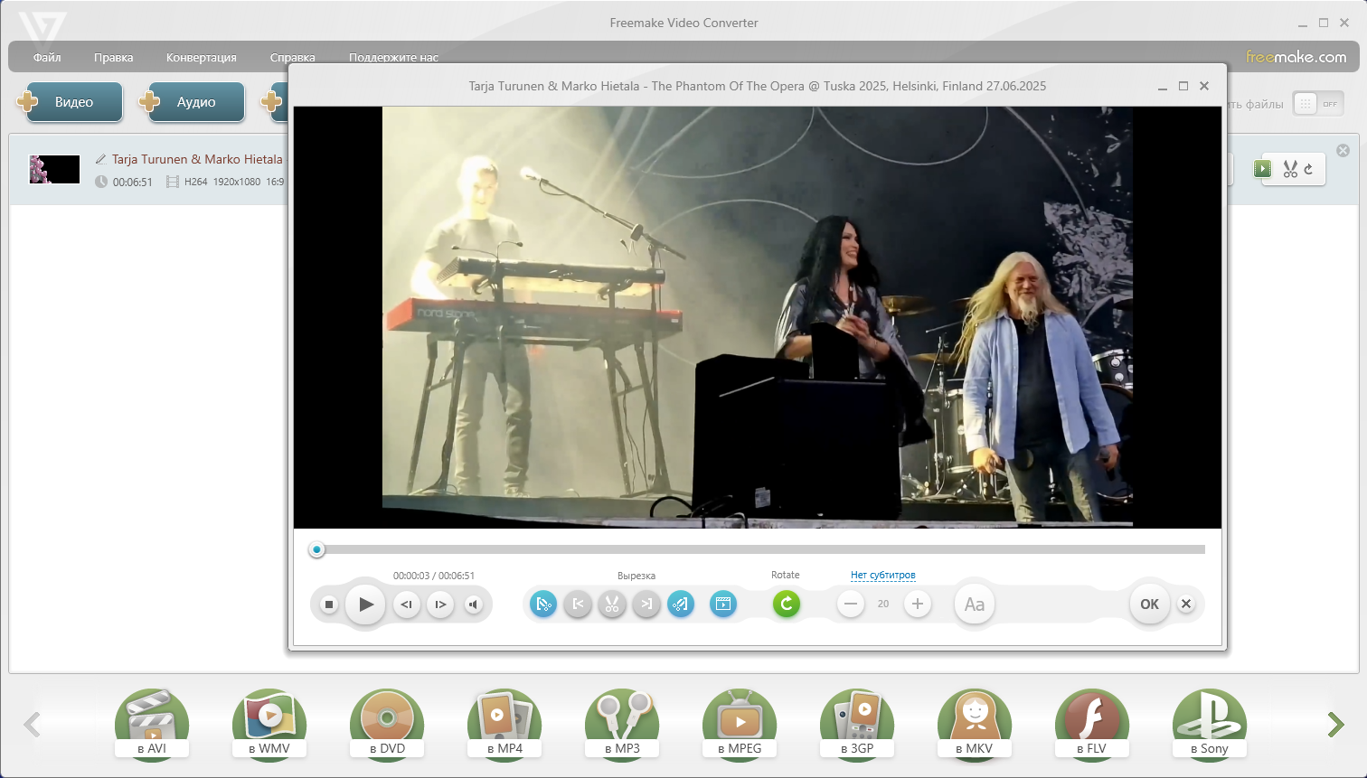 Freemake Video Converter конвертирует видео в таких форматах, как MP4, AVI, MKV, WMV, MP3, DVD, 3GP, SWF, FLV, HD, MOV, RM,QT, Divx, Xvid, TS, Fraps и др. Поддерживаются все современные кодеки: H.264, MKV, MPEG4, AAC. Создавайте видео из аудио и фото. Конвертируйте много файлов одновременно.