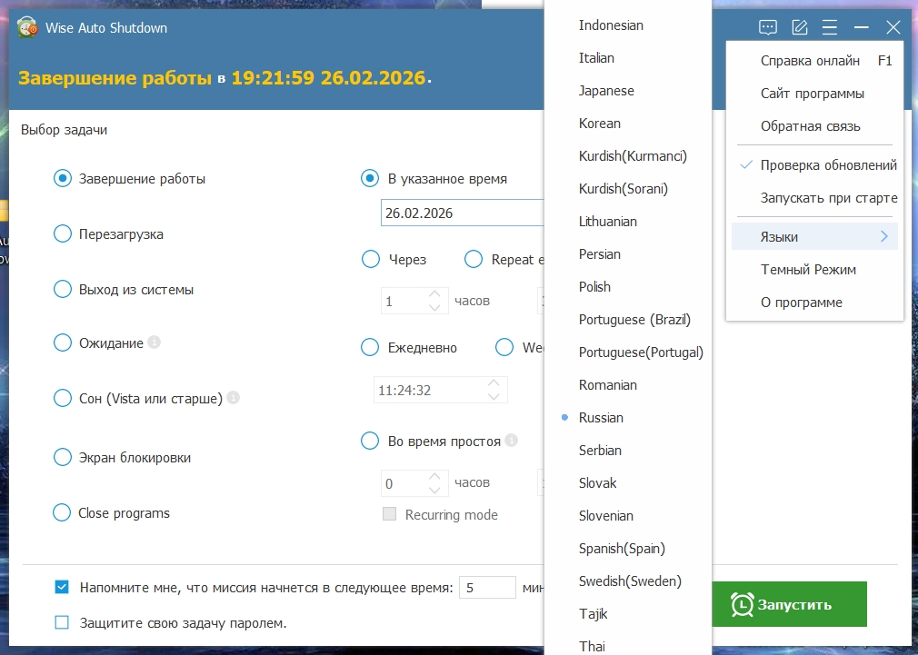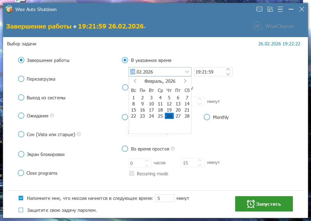 Wise Auto Shutdown позволяет Вам отключать компьютер, перезагружать его, отключать питание, выходить из системы, переходить в спящий режим или в режим гибернации на регулярной основе или определенное время. Это значительно упрощает управление питанием. Работает в фоновом режиме и показывает напоминание за 5 минут перед выполнением, если стоит соответствующая галочка.