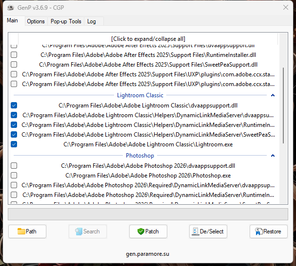 • Запустить патч GenP-v3.6.9 > Поиск > Выбрать файлы которые нужно пропатчировать (в списке будут все продукты от Adobe которые у вас установлены) > "Патч"