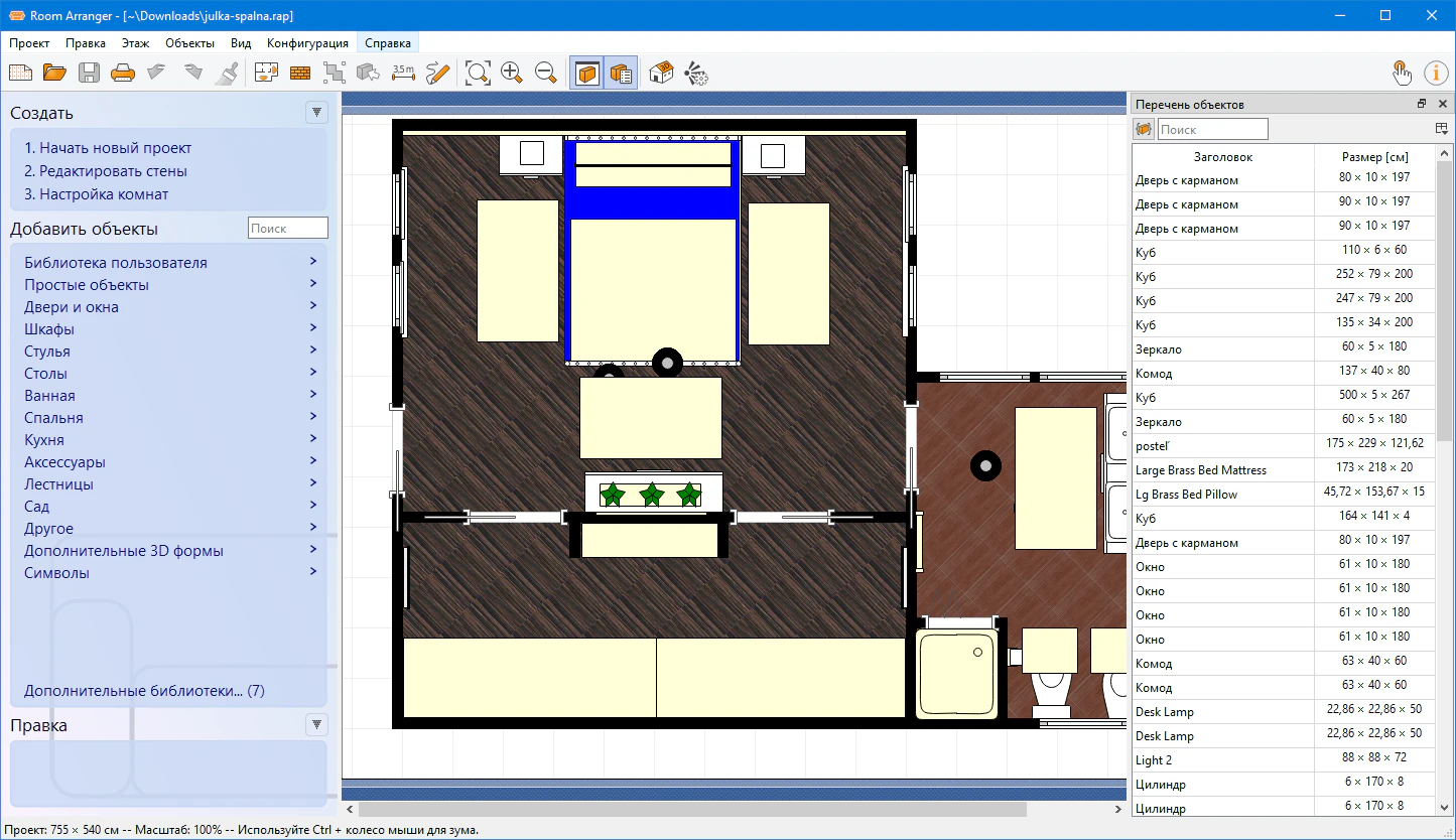 • С Room Arranger можно создавать и редактировать любые элементы интерьера, двигать их, вращать, изменять цвет и размеры. В программе имеется богатейшая библиотека предметов интерьера, более того вы сможете воспользоваться дополнительной бесплатной библиотекой картинок предметов, посетив официальный сайт программы.