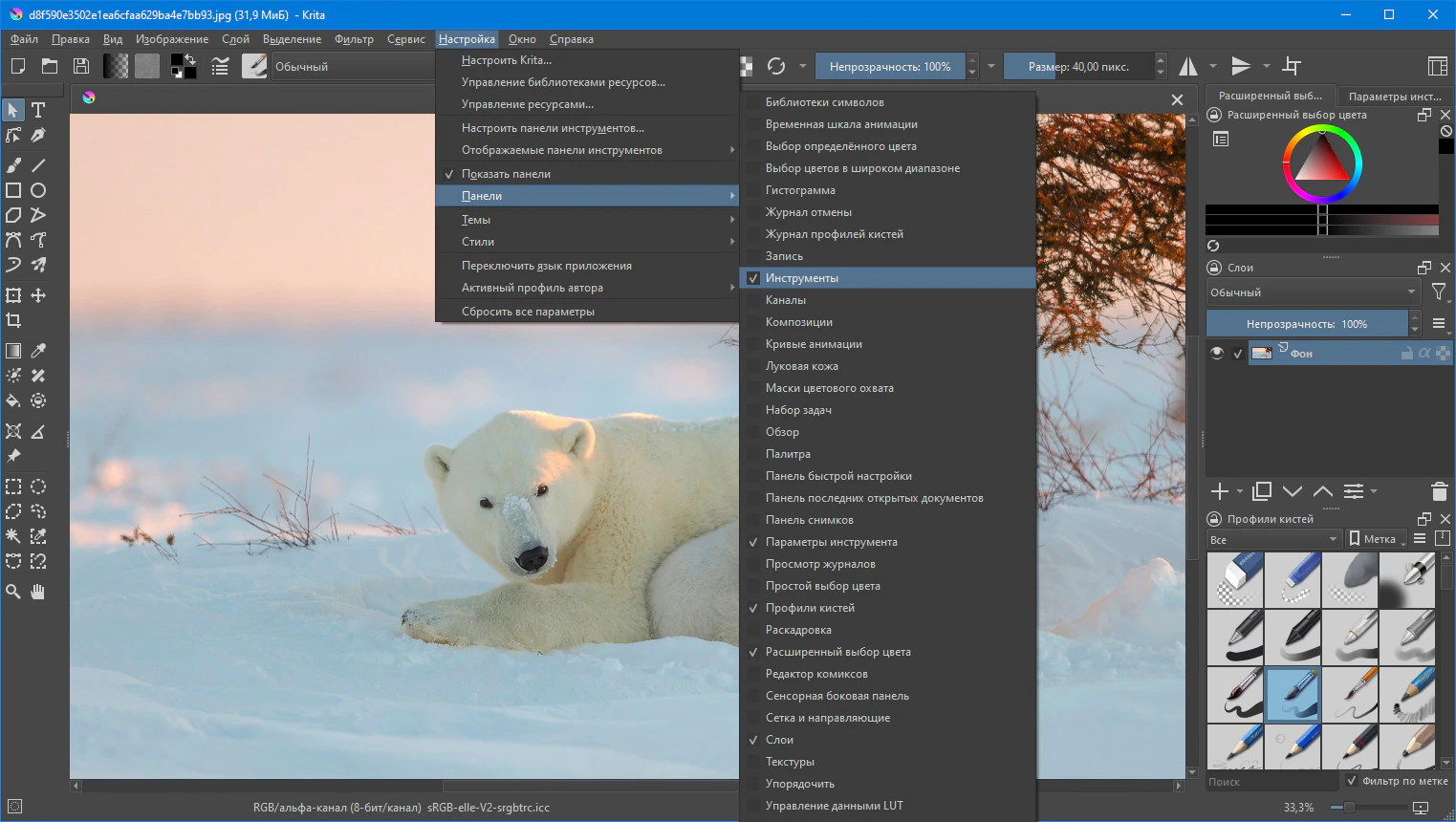 Программа имеет широкий функционал. Редактор поддерживает многослойную обработку изображений, предоставляет средства для работы с различными цветовыми моделями и обладает большим набором средств для цифровой живописи, создания скетчей и формирования текстур. Из богатых возможностей Krita стоит отметить большой выбор графических эффектов для стилизации работы под акварель, масляные краски, пикселизацию, постеризацию и многое другое.