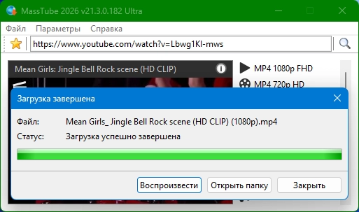 MassTube — очень простая в использовании программа для скачивания видео с YouTube (и не только) с помощью одного клика. Достаточно в строку поиска вставить адрес понравившегося ролика и нажать поиск, после чего программа предоставит список форматов и разрешений, в которых можно быстро скачать данный клип.