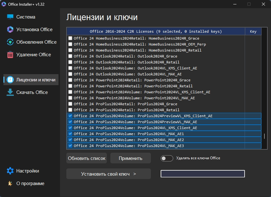 После удаления офиса штатными средствами в системе остаются его лицензии и ключи. Если у вас ранее был установлен, например, Office 2016, вы его удалили и установили Office 2024 - может так получиться, что в свойствах офисного приложения вы увидите не Office 2024, а Office 2016. Чтобы такого не произошло, желательно после удаления старого офиса в разделе программы "Лицензии Office" посмотреть оставшиеся в системе лицензии и удалить ненужные. Если удалять лицензии с включенным переключателем "Удалить ключи" - из системы удалятся ключи, с которыми был установлен старый офис.