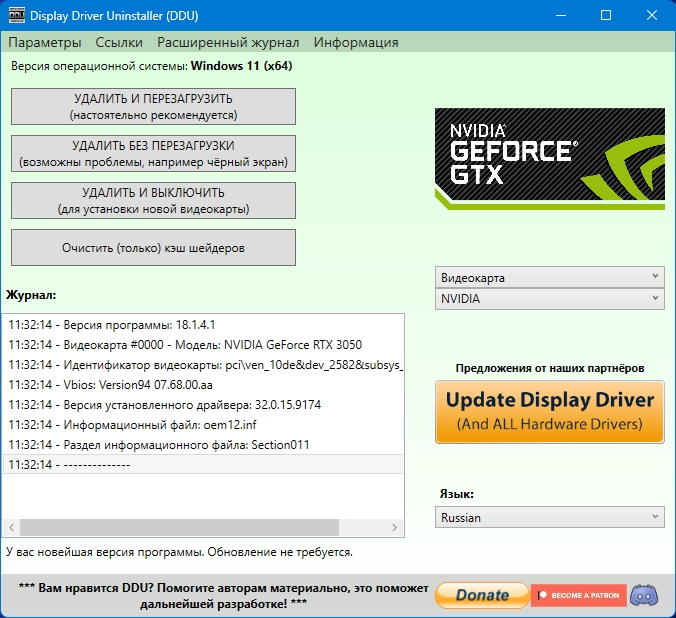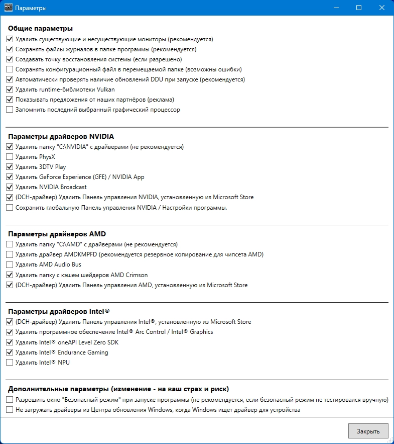 Display Driver Uninstaller это утилита удаления драйверов, которая поможет вам полностью удалить драйверы видеокарты AMD / NVIDIA / Intel и драйверы звуковой карты Realtek / Sound Blaster из системы, не оставляя кучу ненужных файлов (включая ключи реестра, папки и файлы). DDU предназначен для использования в случаях, когда стандартными способами драйвера не удаляются, или когда нужно тщательно удалить драйверы видеокарты. После использования этого инструмента будет так, будто драйверов не было, как при чистой установке системы. Как и для любого инструмента такого рода, рекомендуется создать новую точку восстановления системы перед ее использованием, чтобы можно было вернуть прежнее состояние системы, если вы столкнетесь с проблемами.