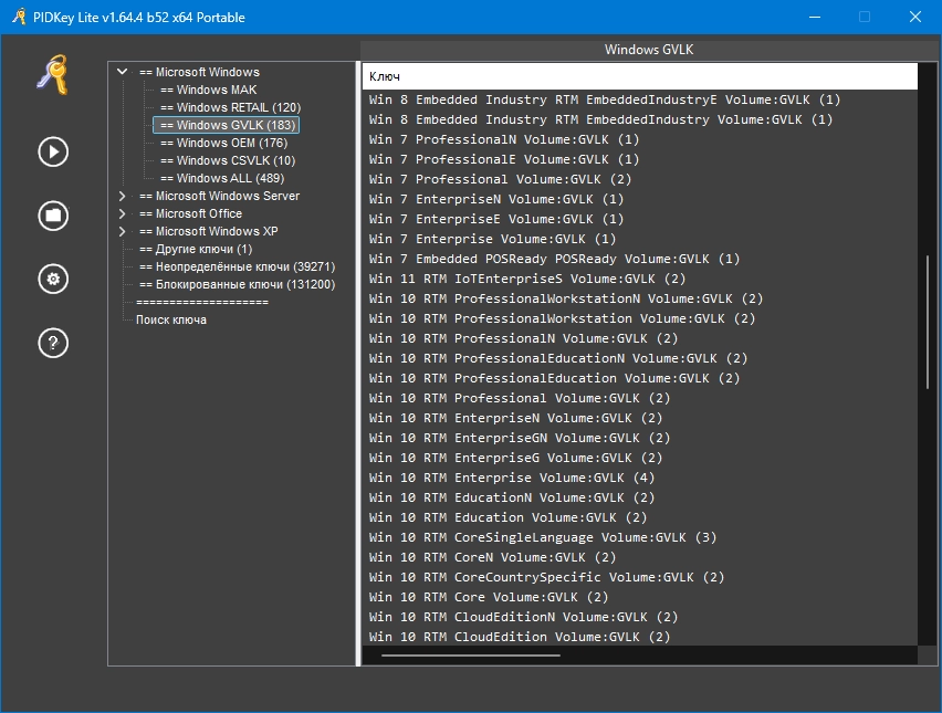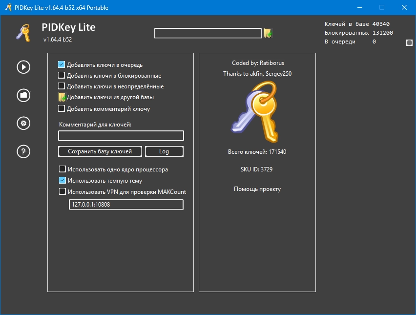 Она позволяет заменить PIDKey by Ratiborus, Ultimate PID Checker by janek2012 и VAMT. Программа PIDKey Lite является правопреемницей PIDKey и взяла из нее лучшие идеи. Основной особенностью программы является создание SQL-базы в отличие от PIDKey, где база фактически хранилась в текстовых файлах. Программа позволяет добавлять новые ключи в двух режимах (режимы добавления ключей будут описаны ниже) и проверять их, находить в базе нужные ключи, обновлять информацию о них и (или) перемещать их в блокированные.