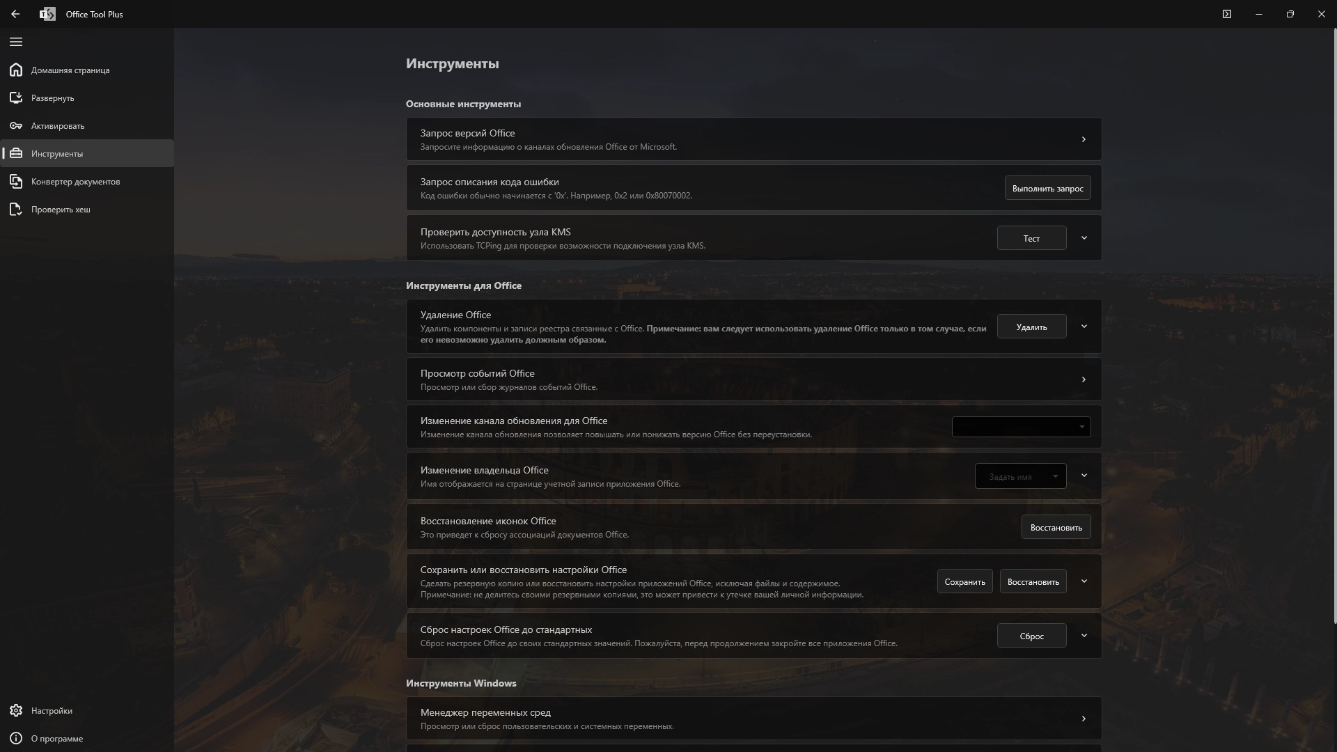 • Интегрированные инструменты Office, включая сброс настроек, устранение проблем с Office.