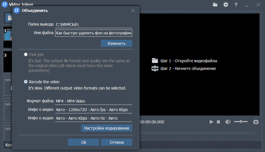 • Объединенное видео может быть в любом видеоформате.