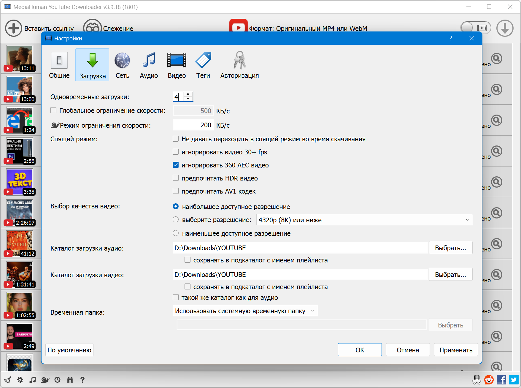Программа поддерживает загрузку всех доступных разрешений, но выбор остается за вами, будет это 720p, 1080p, 4K или 8K, 60 fps или 30.