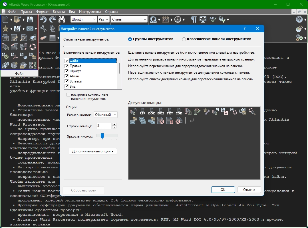 • Поддерживается работа с документами форматов RTF, MS Word, MS Write, TXT.
